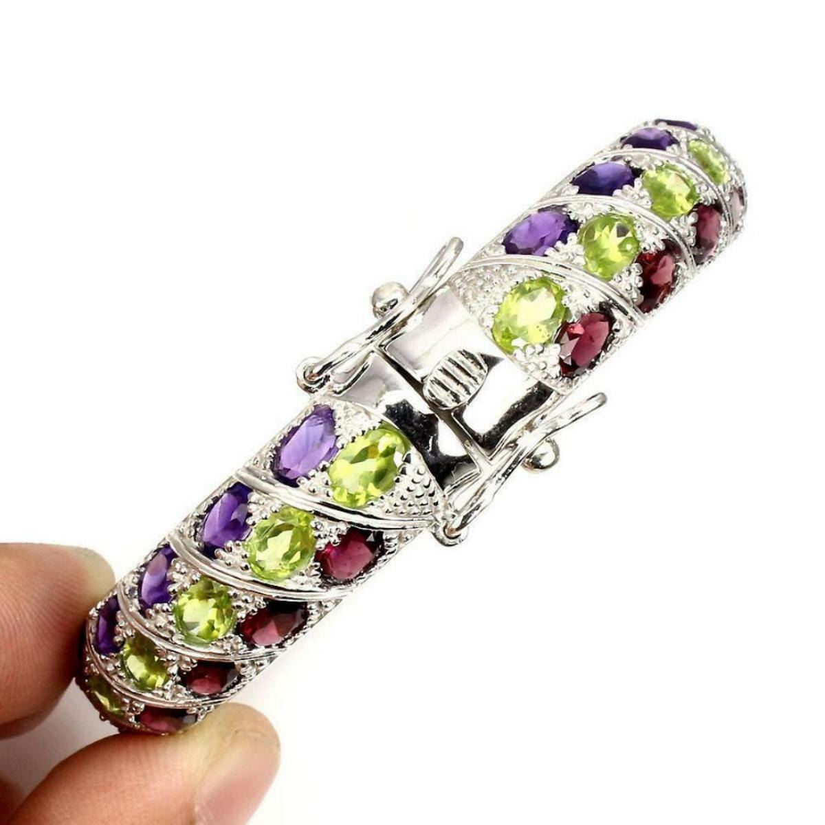 925 STERLING SILVER;PLATE14K WHITE GOLD;LENGTH - Free size;MAIN STONEPERIDOT;OTHER GEMSAMETHYST,RHODOLITE GARNET;TOTAL WEIGHT196.25 CT (TOTAL WEIGHT OF SILVER + STONE)DIMENSION* STONE 6.0 X 4.0 MM. * DIAMETER 2.2 X 2.1 INCHES. * FACE BANGLE 65.0 X 12.0 MM.MAIN STONE SHAPEOVAL CUTMAIN STONE COLORTOP RICH GREENCLARITY/GRADEIF TO VVSLUSTERGLORIOUSTREATMENTUNHEATEDORIGINPAKISTANHARDNESS6.5 - 7.5
