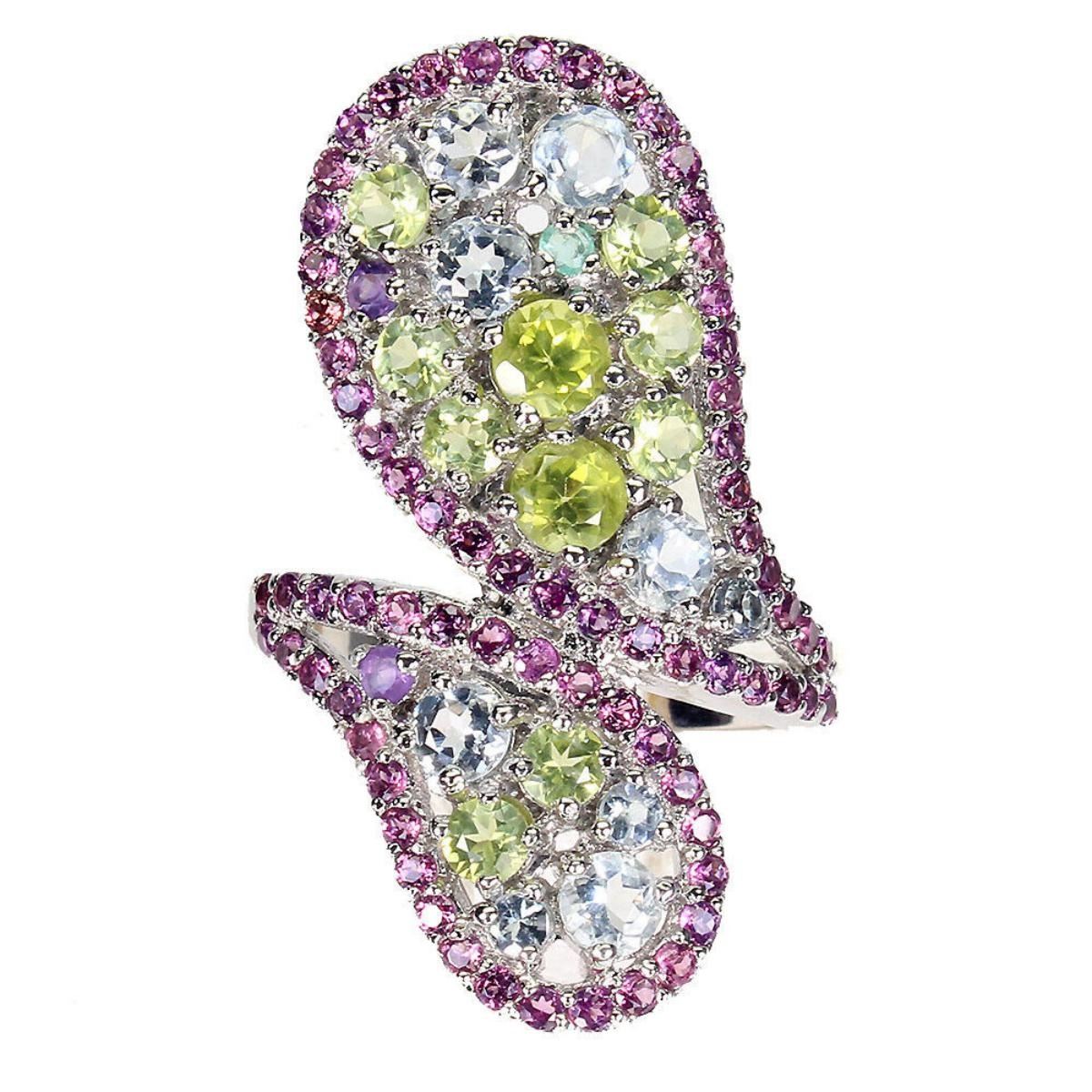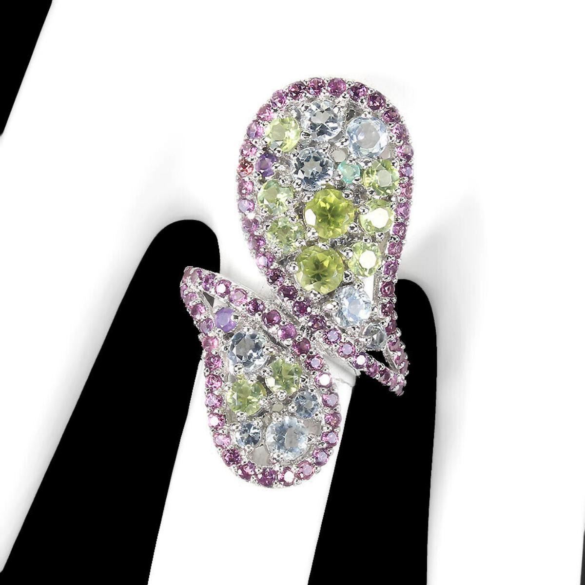 925 STERLING SILVER;PLATE-14K WHITE GOLD;RING SIZE/Resizable-8.5;MAIN STONE-PERIDOT;OTHER GEMS-AQUAMARINE, RHODOLITE GARNET;TOTAL WEIGHT-6.41 GRAM (TOTAL WEIGHT OF SILVER + STONE)DIMENSION-* STONE 1.5 TO 4.0 MM.;* FACE RING- 34.0 X 22.0 MM.;MAIN STONE SHAPE-ROUND CUT;MAIN STONE COLOR- GREEN;CLARITY/GRADE-IF TO VVS;TREATMENT-UNHEATED;ORIGIN-PAKISTAN;HARDNESS-6.5 - 7.0;
