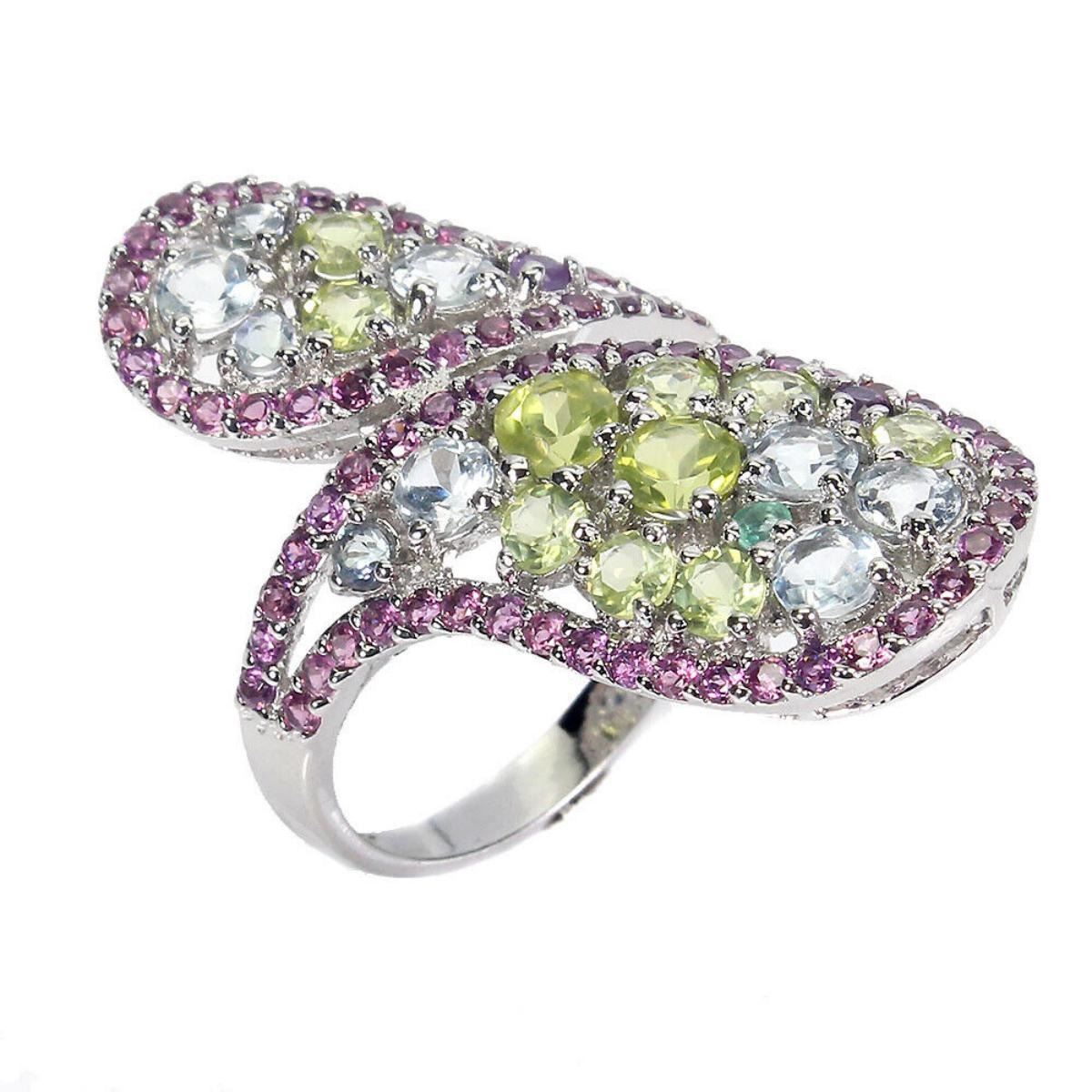 925 STERLING SILVER;PLATE-14K WHITE GOLD;RING SIZE/Resizable-8.5;MAIN STONE-PERIDOT;OTHER GEMS-AQUAMARINE, RHODOLITE GARNET;TOTAL WEIGHT-6.41 GRAM (TOTAL WEIGHT OF SILVER + STONE)DIMENSION-* STONE 1.5 TO 4.0 MM.;* FACE RING- 34.0 X 22.0 MM.;MAIN STONE SHAPE-ROUND CUT;MAIN STONE COLOR- GREEN;CLARITY/GRADE-IF TO VVS;TREATMENT-UNHEATED;ORIGIN-PAKISTAN;HARDNESS-6.5 - 7.0;