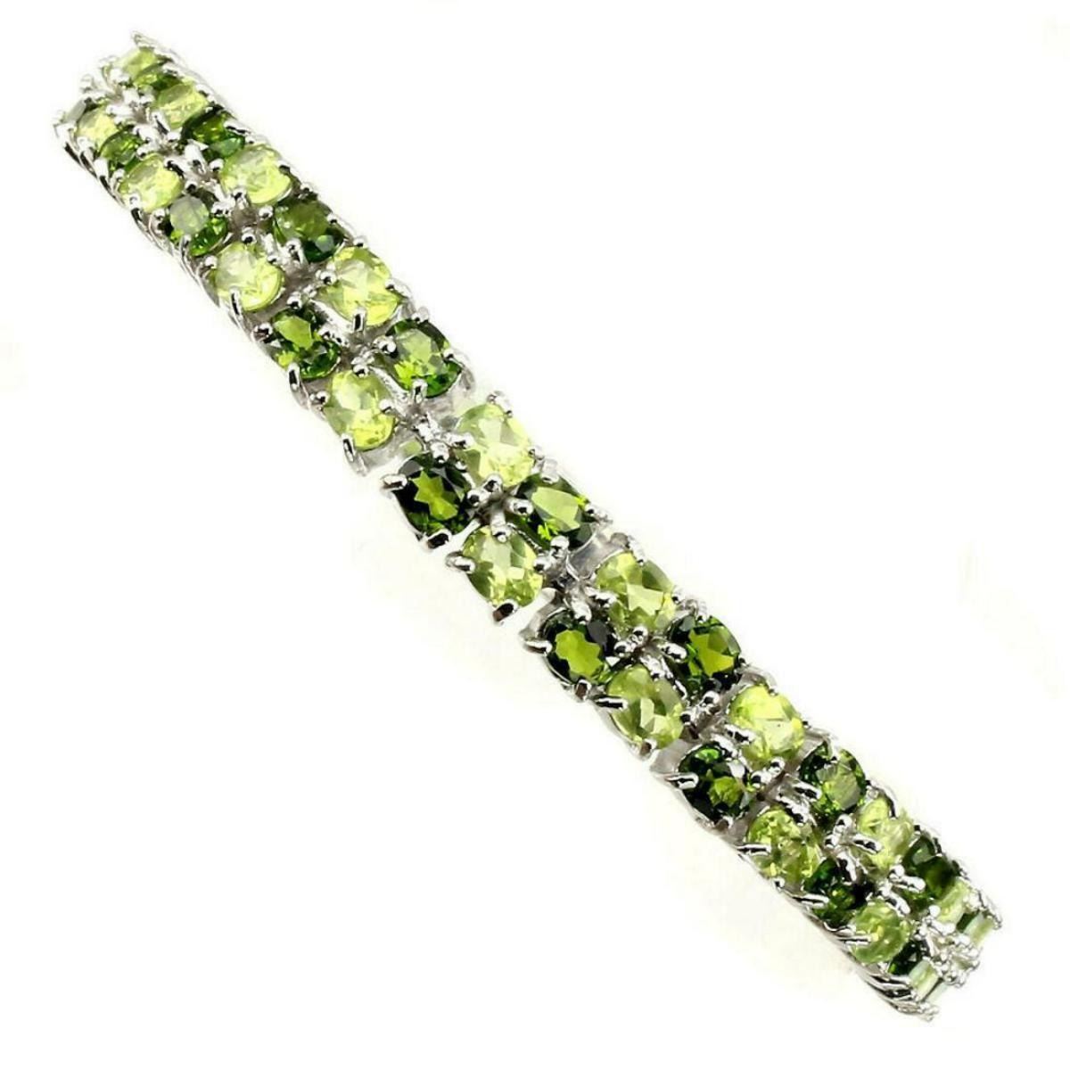 925 STERLING SILVER;PLATE....14K WHITE GOLD;LENGTH (INCHES)7.5;MAIN STONEPERIDOT;OTHER GEMSCHROME DIOPSIDE;TOTAL WEIGHT93.56 CT (TOTAL WEIGHT OF SILVER + STONE)DIMENSION* STONE 4.0 X 3.0 MM. * FACE BRACELET 170.0 X 8.0 MM.;MAIN STONE SHAPEOVAL CUT;MAIN STONE COLORTOP RICH GREEN;CLARITY/GRADEIF TO VVS;LUSTERFASCINATING;TREATMENTUNHEATED;ORIGINPAKISTAN;HARDNESS5.0 - 7.0