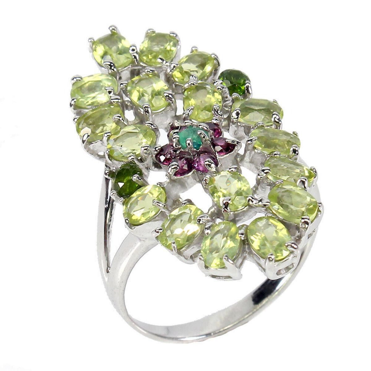 925 STERLING SILVER;PLATE-14K WHITE GOLD;RING SIZE-8(RESIZABLE);MAIN STONE-PERIDOT;OTHER GEMS-CHROME DIOPSIDE, EMERALD, RHODOLITE GARNET;TOTAL WEIGHT-5.69 GRAM (TOTAL WEIGHT OF SILVER + STONE);DIMENSION-* STONE 2.0 TO 4.0 X 3.0 MM.* RING SIZE 8.0* FACE RING 29.0 X 16.0 MM.;MAIN STONE SHAPE-OVAL; MAIN STONE COLOR-GREEN;CLARITY/GRADE-IF TO VVS;TREATMENT-UNHEATED;ORIGIN-PAKISTAN;HARDNESS-6.5 - 7.0;