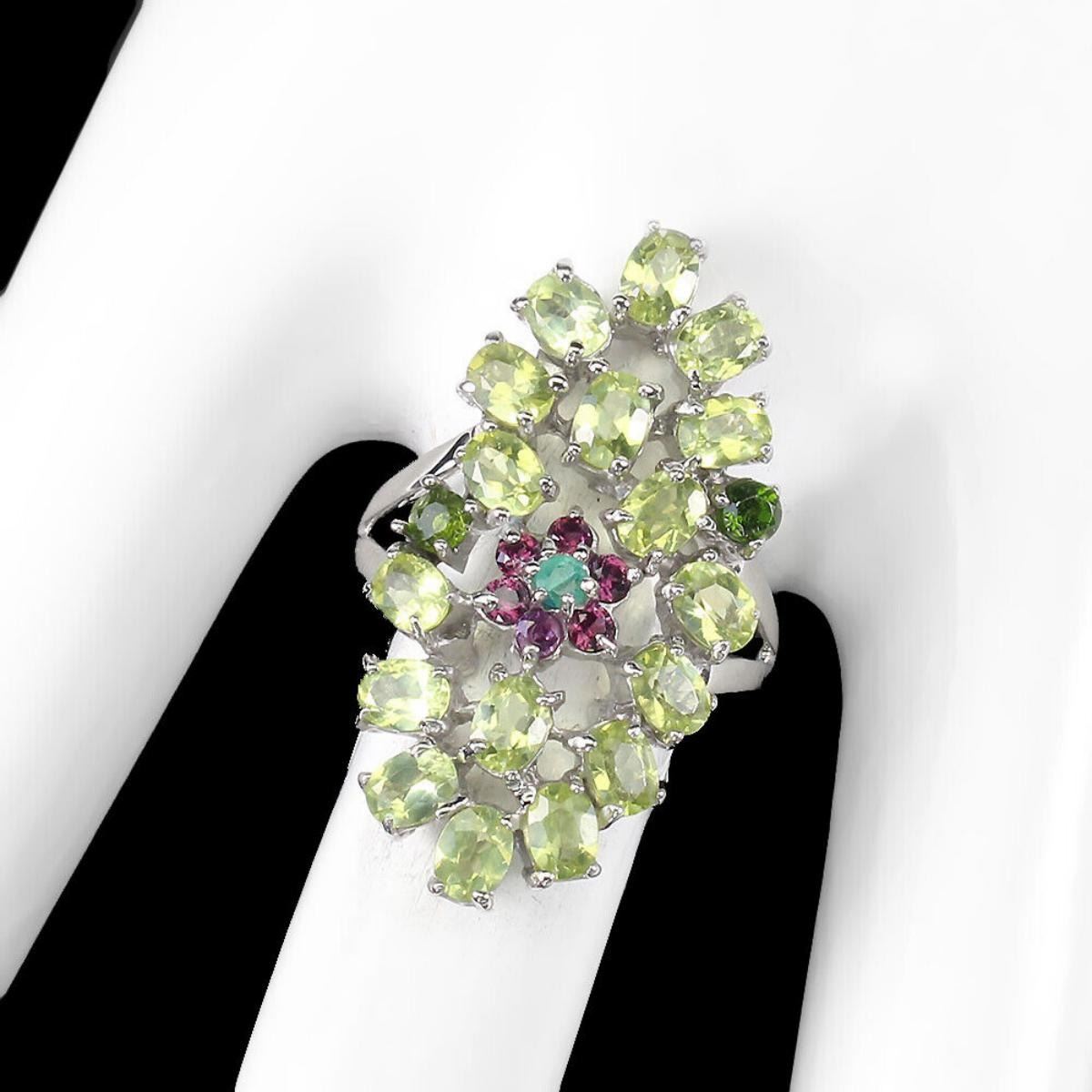 925 STERLING SILVER;PLATE-14K WHITE GOLD;RING SIZE-8(RESIZABLE);MAIN STONE-PERIDOT;OTHER GEMS-CHROME DIOPSIDE, EMERALD, RHODOLITE GARNET;TOTAL WEIGHT-5.69 GRAM (TOTAL WEIGHT OF SILVER + STONE);DIMENSION-* STONE 2.0 TO 4.0 X 3.0 MM.* RING SIZE 8.0* FACE RING 29.0 X 16.0 MM.;MAIN STONE SHAPE-OVAL; MAIN STONE COLOR-GREEN;CLARITY/GRADE-IF TO VVS;TREATMENT-UNHEATED;ORIGIN-PAKISTAN;HARDNESS-6.5 - 7.0;