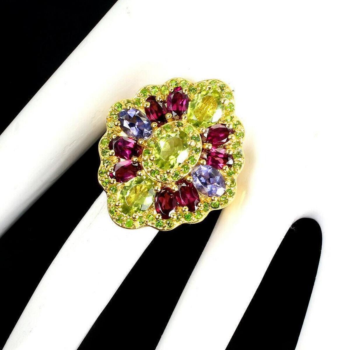 925 STERLING SILVER;PLATE-14K YELLOW GOLD;RING SIZE (resizeable)9;MAIN STONE-PERIDOT;;OTHER GEMS-CHROME DIOPSIDE, IOLITE, RHODOLITE GARNET;TOTAL WEIGHT-11.97 GRAM (TOTAL WEIGHT OF SILVER + STONE)DIMENSION-* STONE 1.5 TO 8.0 X 6.0 MM. * RING SIZE 9.0 * FACE RING- 33.0 X 28.0 MM.;MAIN STONE SHAPE-OVAL CUT;MAIN STONE COLOR-TOP RICH GREEN;CLARITY/GRADE-IF TO VVS;TREATMENT-UNHEATED;;ORIGIN-PAKISTAN, africa;HARDNESS6;