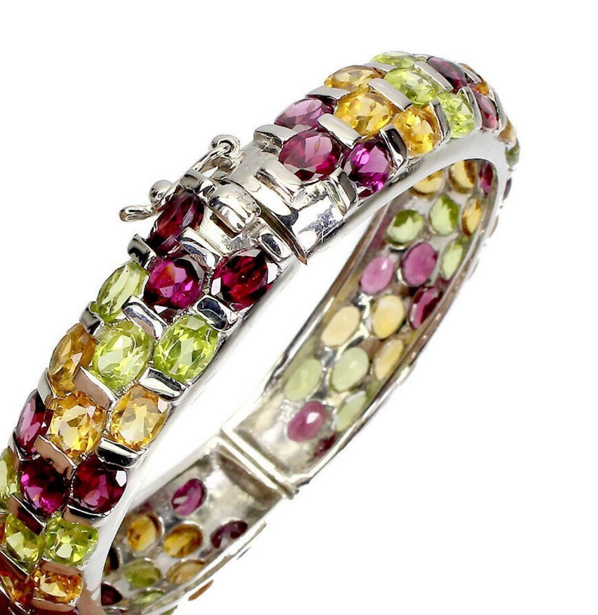 925 STERLING SILVER; PLATE- 14K WHITE GOLD; MAIN STONE- PERIDOT; OTHER GEMS- CITRINE, RHODOLITE GARNET; TOTAL WEIGHT- 33.71 GRAM (TOTAL WEIGHT OF SILVER + STONE) DIMENSION- * STONE 5.0 X 4.0 MM. * DIAMETER 2.2 X 2.1 INCHES. * FACE BANGLE -63.0 X 11.0 MM.; MAIN STONE SHAPE- OVAL CUT; MAIN STONE COLOR- TOP RICH GREEN; CLARITY/GRADE- IF TO VVS; TREATMENT- UNHEATED; ORIGIN -PAKISTAN; HARDNESS- 6.5 - 7.0;