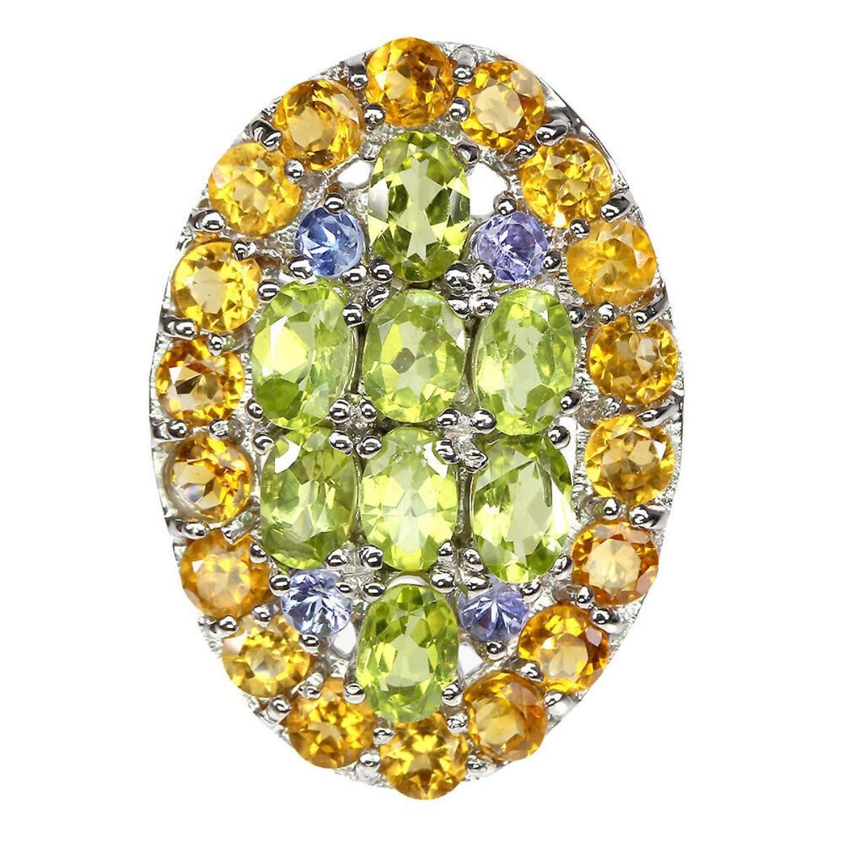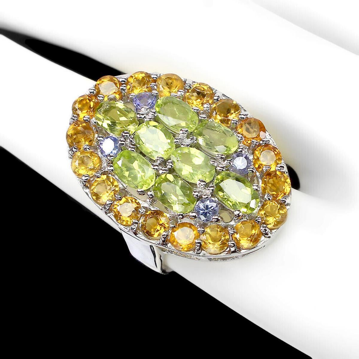 925 STERLING SILVER;PLATE-14K WHITE GOLD;RING SIZE-9(RESIZABLE);MAIN STONE-PERIDOT;OTHER GEMS-CITRINE, TANZANITE;TOTAL WEIGHT-10.98 GRAM (TOTAL WEIGHT OF SILVER + STONE);DIMENSION-* STONE 3.0 TO 6.0 X 4.0 MM.* RING SIZE 9.0* FACE RING 31.0 X 22.0 MM.;MAIN STONE SHAPE-OVAL ;MAIN STONE COLOR-GREEN;CLARITY/GRADE-IF TO VVS;TREATMENT-UNHEATED;ORIGIN-PAKISTAN;HARDNESS-6.5 - 7.0;