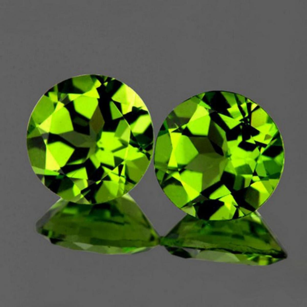Natural Peridot......top quality; SHAPE : Round SIZE ( L x W x D ) : 9.00 mm QUANTITY : 2 pieces (Perfectly Matched Pair) COLOR : AAA Green Best Color; CLARITY : Flawless-VVS1 AAA Grade ORIGIN : PAKISTAN; HARDNESS : 7