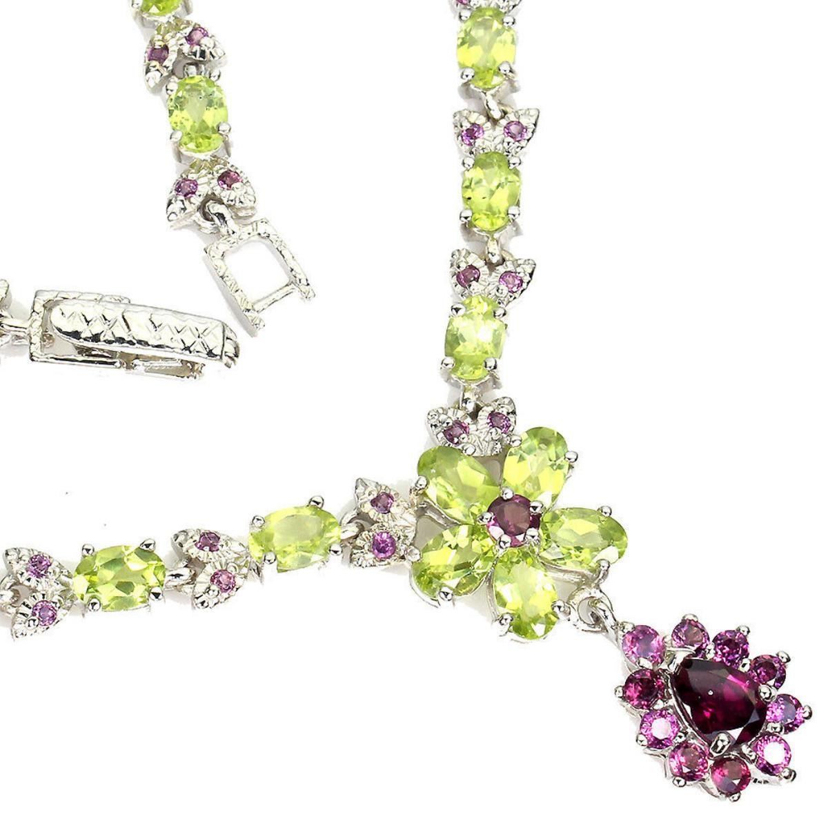 925 STERLING SILVER;PLATE-14K WHITE GOLD;LENGTH (INCHES)18.5;MAIN STONE-PERIDOT;OTHER GEMS-RHODOLITE GARNET;TOTAL WEIGHT-31.59 GRAM (TOTAL WEIGHT OF SILVER + STONE)DIMENSION-* STONE 1.5 TO 7.0 X 5.0 MM.;* TOTAL LENGTH -18.5 INCHES.;* STONES PART LENGTH- 440.0 X 34.0 MM.;MAIN STONE SHAPE-OVAL CUT;MAIN STONE COLOR- GREEN;CLARITY/GRADE-IF TO VVS;TREATMENT-UNHEATED;ORIGIN-PAKISTAN;HARDNESS-6.5 - 7.0;