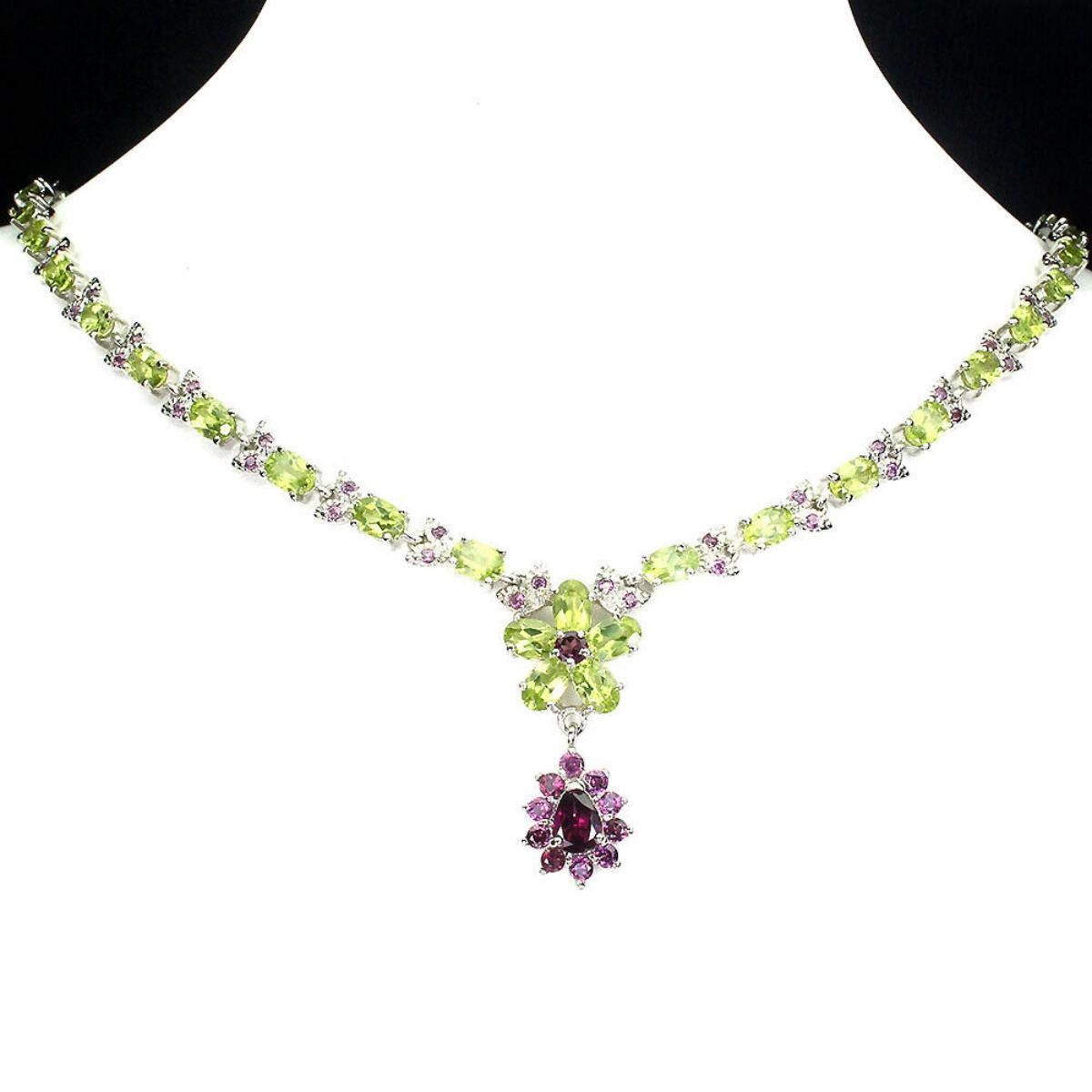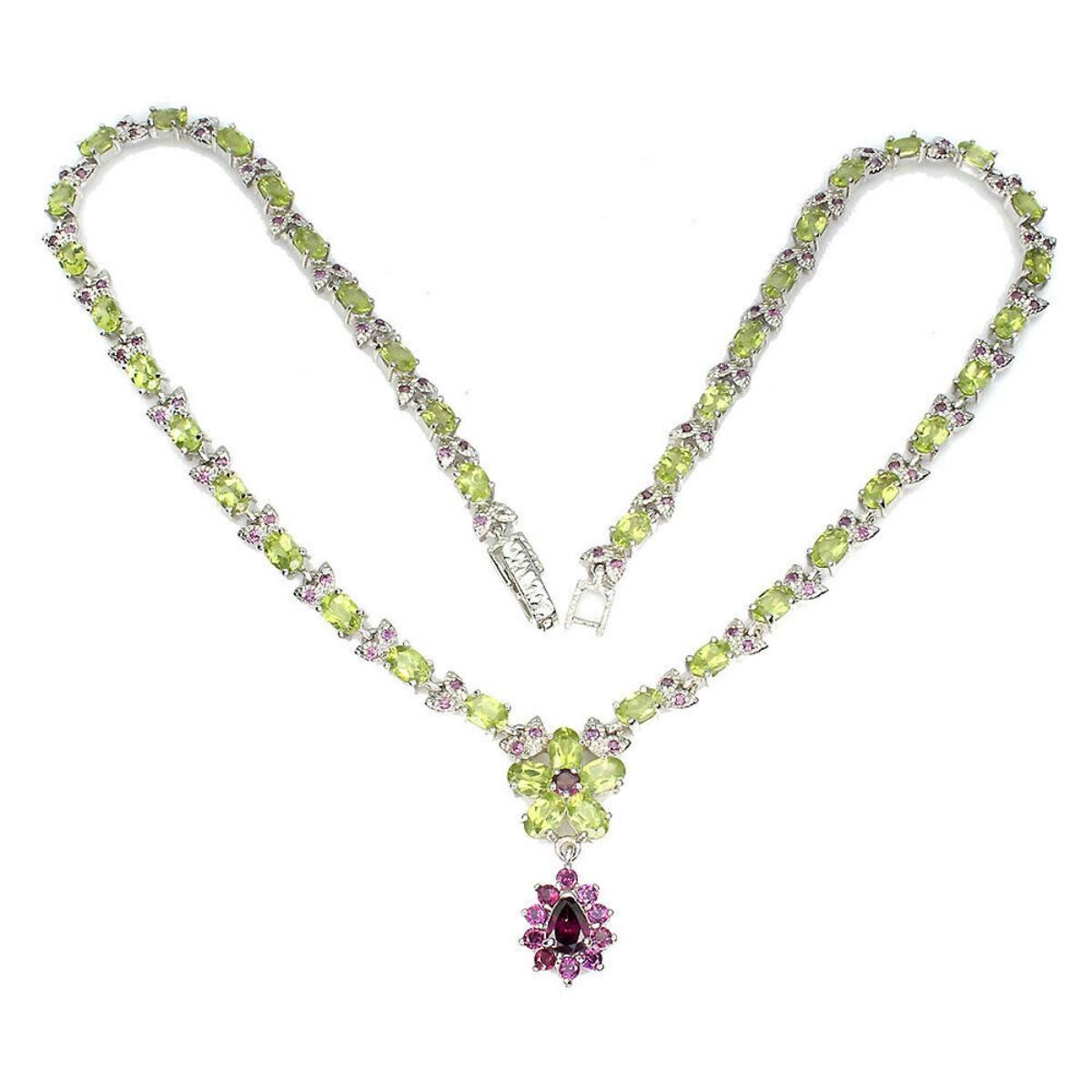 925 STERLING SILVER;PLATE-14K WHITE GOLD;LENGTH (INCHES)18.5;MAIN STONE-PERIDOT;OTHER GEMS-RHODOLITE GARNET;TOTAL WEIGHT-31.59 GRAM (TOTAL WEIGHT OF SILVER + STONE)DIMENSION-* STONE 1.5 TO 7.0 X 5.0 MM.;* TOTAL LENGTH -18.5 INCHES.;* STONES PART LENGTH- 440.0 X 34.0 MM.;MAIN STONE SHAPE-OVAL CUT;MAIN STONE COLOR- GREEN;CLARITY/GRADE-IF TO VVS;TREATMENT-UNHEATED;ORIGIN-PAKISTAN;HARDNESS-6.5 - 7.0;