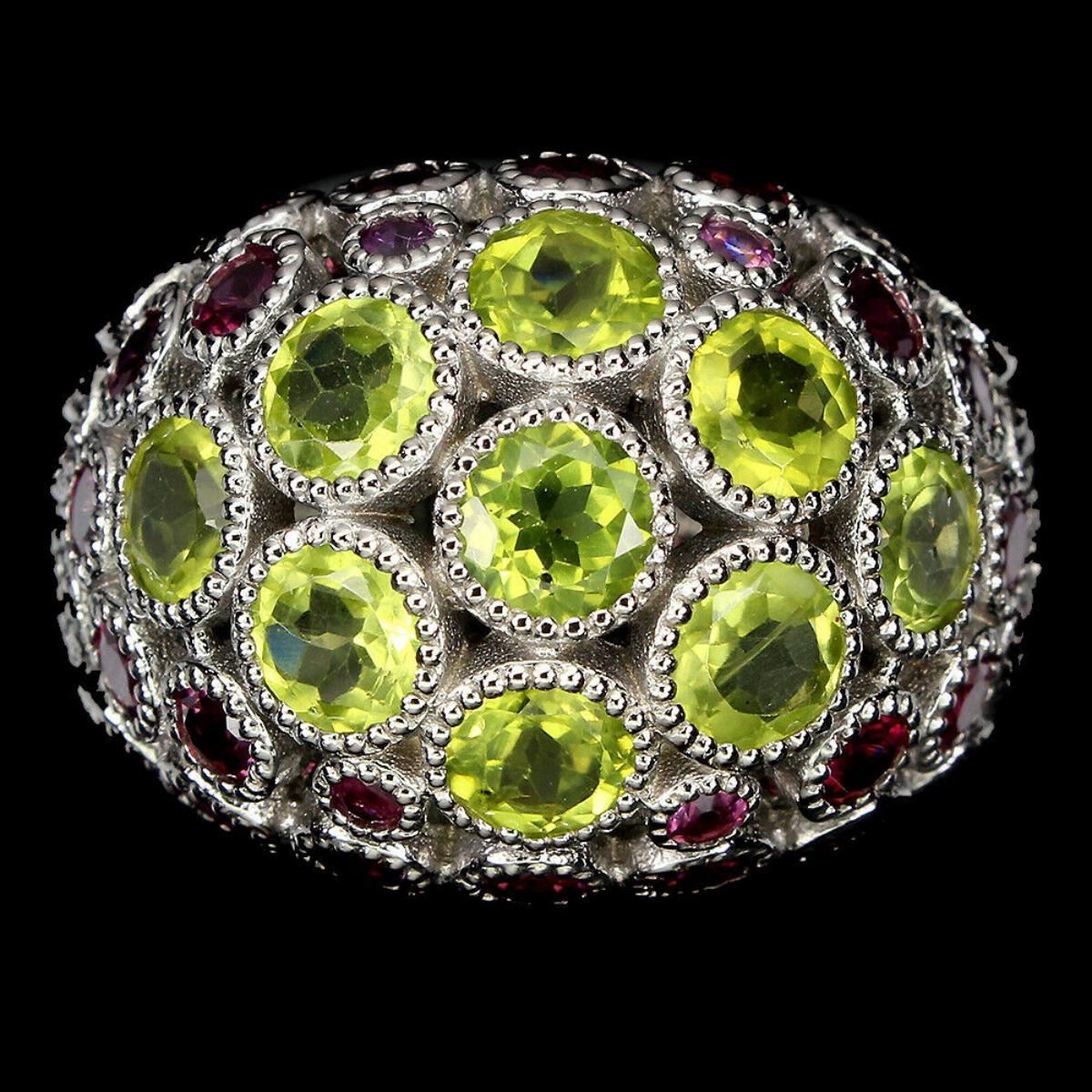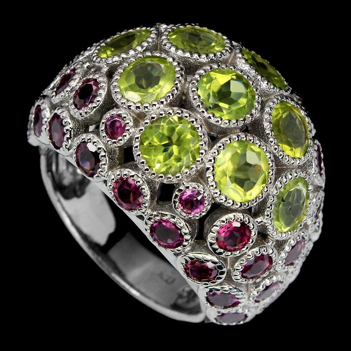 925 STERLING SILVER;PLATE-14K WHITE GOLD;RING SIZE-8(resizeable);MAIN STONE-PERIDOT;OTHER GEMS-RHODOLITE GARNET;TOTAL WEIGHT-12.08 GRAM (TOTAL WEIGHT OF SILVER + STONE)DIMENSION-* STONE 2.0 TO 5.0 MM. * RING SIZE 8.0 * FACE RING 26.0 X 19.0 MM.;MAIN STONE SHAPE-ROUND CUT;MAIN STONE COLOR-TOP RICH GREEN;CLARITY/GRADE-IF TO VVS;TREATMENT-UNHEATED;ORIGIN-PAKISTAN;HARDNESS-6;