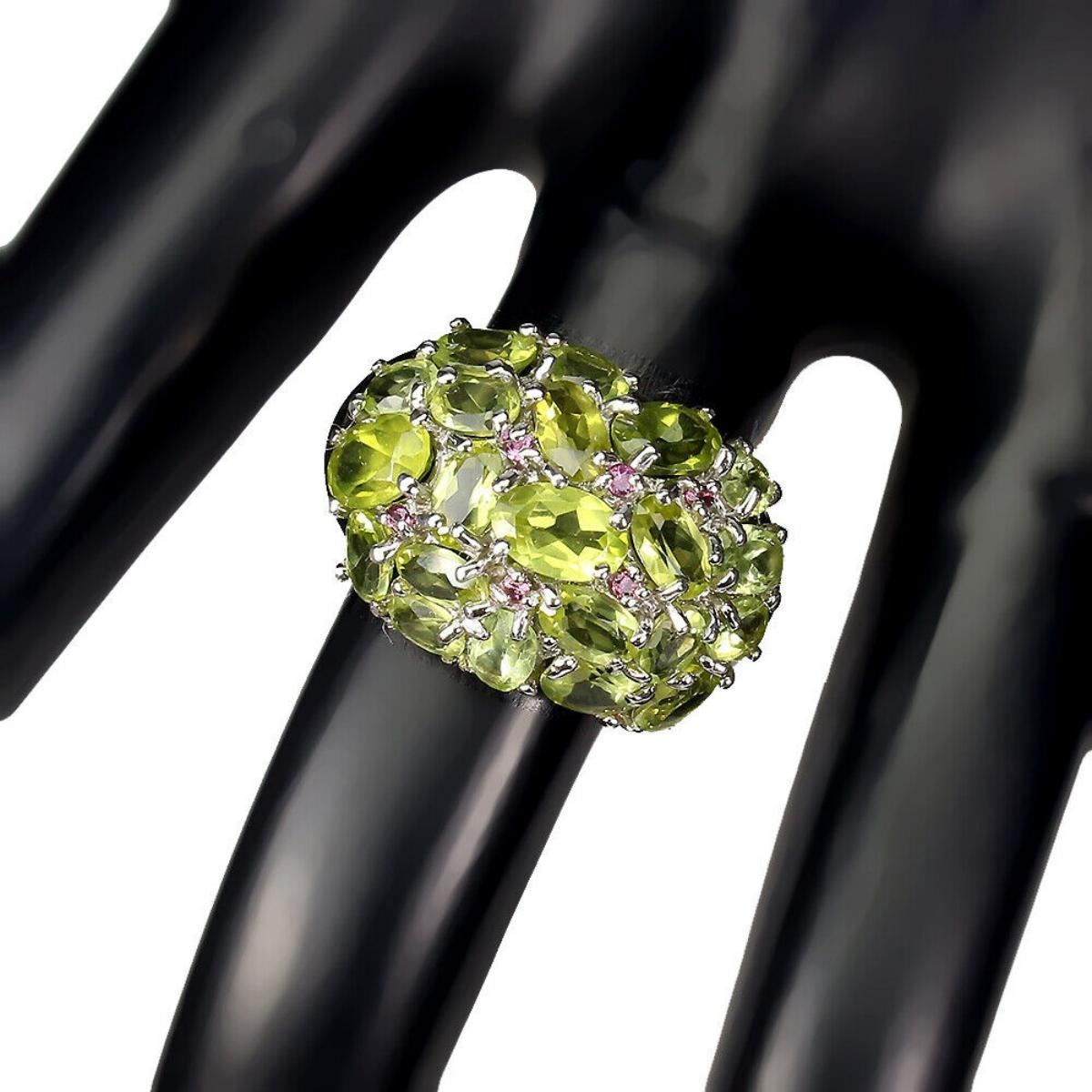 925 STERLING SILVER;PLATE-14K WHITE GOLD;RING SIZE (RESIZABLE)-8;MAIN STONE-PERIDOT;OTHER GEMS-RHODOLITE GARNET;TOTAL WEIGHT-5.53 GRAM (TOTAL WEIGHT OF SILVER + STONE);DIMENSION-* STONE 1.0 TO 6.0 X 4.0 MM.* RING SIZE 8.0* FACE RING 22.0 X 16.0 MM.;MAIN STONE SHAPE-OVAL ;MAIN STONE COLOR- GREEN;CLARITY/GRADE-IF TO VVS;TREATMENT-UNHEATED;ORIGIN-PAKISTAN;HARDNESS-6.5 - 7.0;