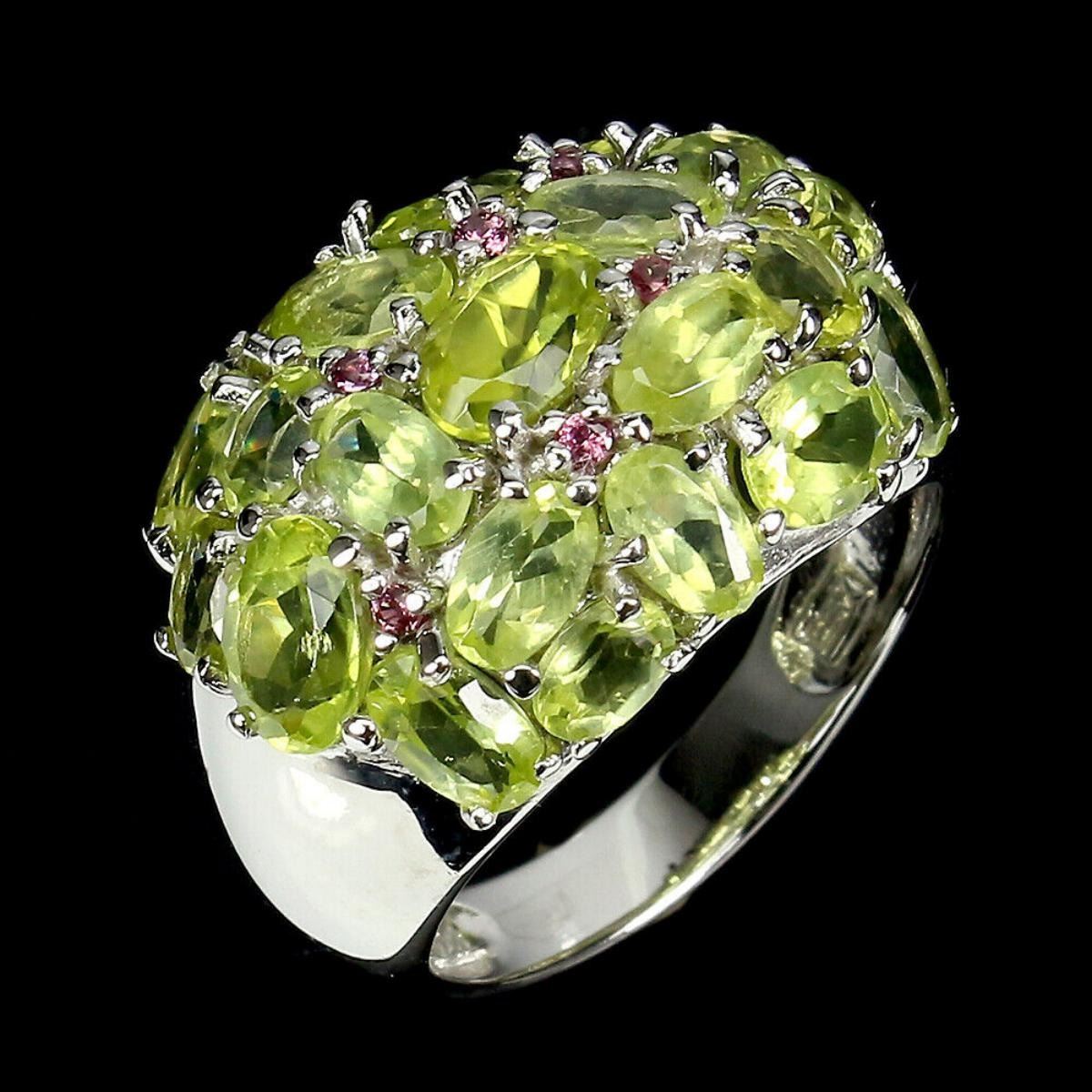 925 STERLING SILVER;PLATE-14K WHITE GOLD;RING SIZE-8(RESIZABLE);MAIN STONE-PERIDOT;OTHER GEMS-RHODOLITE GARNET;TOTAL WEIGHT-5.53 GRAM (TOTAL WEIGHT OF SILVER + STONE);DIMENSION-* STONE 1.0 TO 6.0 X 4.0 MM.* RING SIZE 8.0* FACE RING 22.0 X 16.0 MM.;MAIN STONE SHAPE-OVAL ;MAIN STONE COLOR- GREEN;CLARITY/GRADE-IF TO VVS;TREATMENT-UNHEATED;ORIGIN-PAKISTAN;HARDNESS-6;