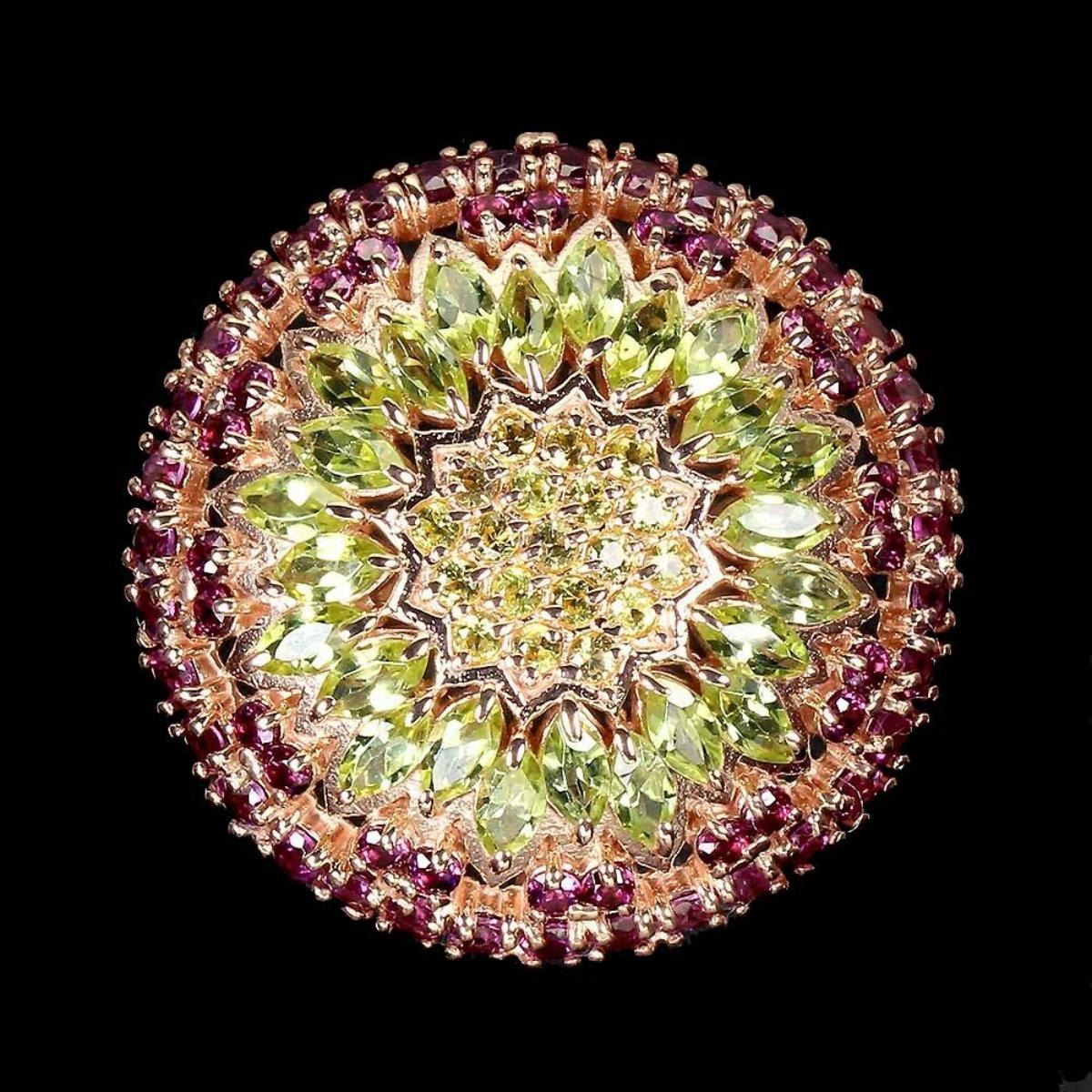 925 STERLING SILVER;PLATE-14K ROSE GOLD;RING SIZE/Resizable8.5;MAIN STONE-PERIDOT;OTHER GEMS-RHODOLITE GARNET, SAPPHIRE;TOTAL WEIGHT-13.54 GRAM (TOTAL WEIGHT OF SILVER + STONE)DIMENSION-* STONE 2.0 TO 5.0 X 2.5 MM. * RING SIZE 8.5 * FACE RING- 33.0 X 33.0 MM.;MAIN STONE SHAPE-MARQUISE CUT;MAIN STONE COLOR-TOP RICH GREEN;CLARITY/GRADE-IF TO VVS;TREATMENT-UNHEATED;ORIGIN-PAKISTAN;HARDNESS-6.5 - 7.0;