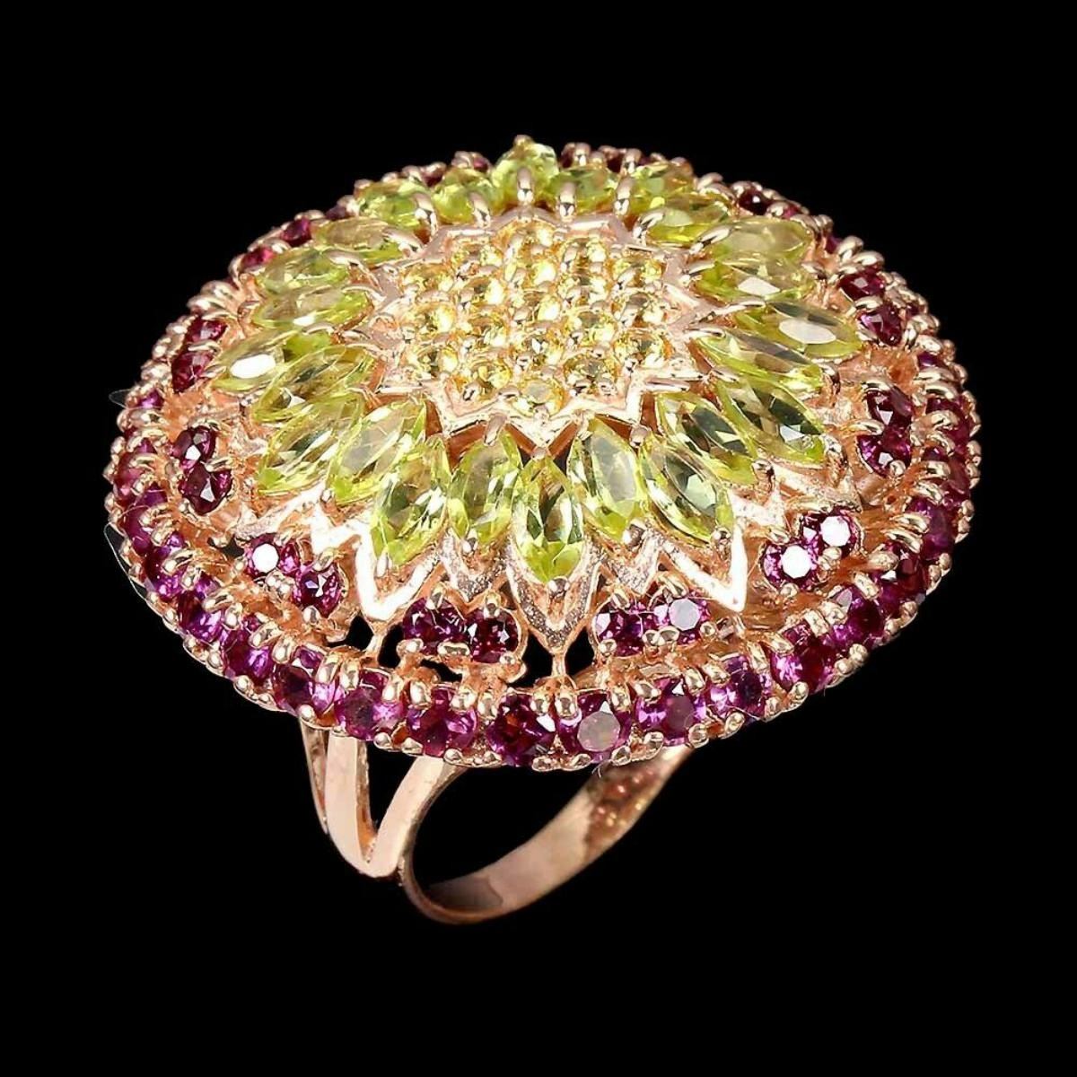 925 STERLING SILVER;PLATE-14K ROSE GOLD;RING SIZE/Resizable8.5;MAIN STONE-PERIDOT;OTHER GEMS-RHODOLITE GARNET, SAPPHIRE;TOTAL WEIGHT-13.54 GRAM (TOTAL WEIGHT OF SILVER + STONE)DIMENSION-* STONE 2.0 TO 5.0 X 2.5 MM. * RING SIZE 8.5 * FACE RING- 33.0 X 33.0 MM.;MAIN STONE SHAPE-MARQUISE CUT;MAIN STONE COLOR-TOP RICH GREEN;CLARITY/GRADE-IF TO VVS;TREATMENT-UNHEATED;ORIGIN-PAKISTAN;HARDNESS-6.5 - 7.0;