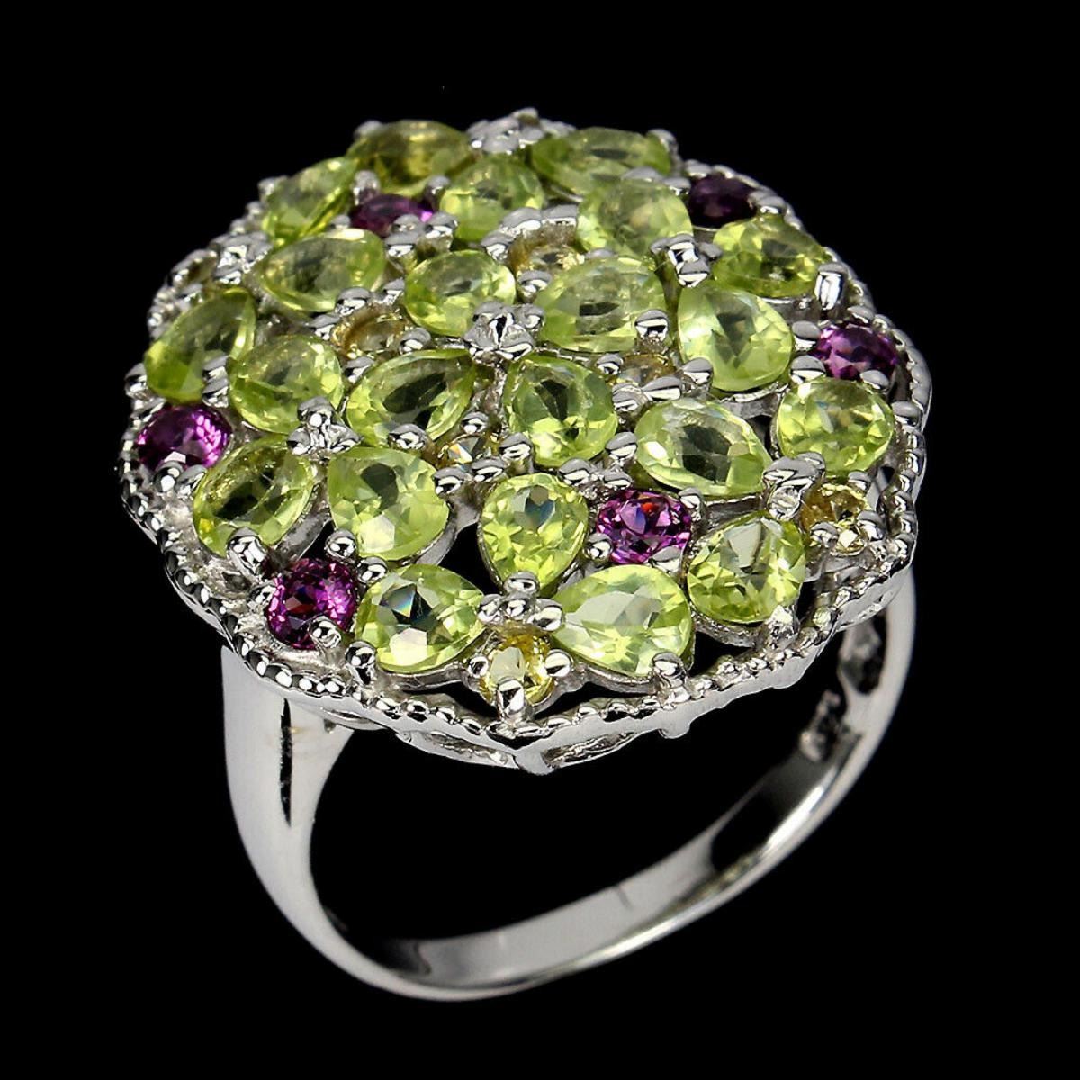 925 STERLING SILVER;PLATE-14K WHITE GOLD;RING SIZE-8(RESIZABLE);MAIN STONE-PERIDOT;OTHER GEMS-RHODOLITE GARNET, SAPPHIRE;TOTAL WEIGHT-6.48 GRAM (TOTAL WEIGHT OF SILVER + STONE);DIMENSION-* STONE 2.0 TO 4.0 X 3.0 MM. * RING SIZE 8.0 * FACE RING 25.0 X 21.0 MM.;MAIN STONE SHAPE-PEAR ;MAIN STONE COLOR- GREEN;CLARITY/GRADE-IF TO VVS;TREATMENT-UNHEATED;ORIGIN-PAKISTAN;HARDNESS-6.5 - 7.0;