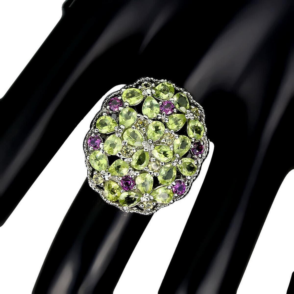 925 STERLING SILVER;PLATE-14K WHITE GOLD;RING SIZE-8(RESIZABLE);MAIN STONE-PERIDOT;OTHER GEMS-RHODOLITE GARNET, SAPPHIRE;TOTAL WEIGHT-6.48 GRAM (TOTAL WEIGHT OF SILVER + STONE);DIMENSION-* STONE 2.0 TO 4.0 X 3.0 MM. * RING SIZE 8.0 * FACE RING 25.0 X 21.0 MM.;MAIN STONE SHAPE-PEAR ;MAIN STONE COLOR- GREEN;CLARITY/GRADE-IF TO VVS;TREATMENT-UNHEATED;ORIGIN-PAKISTAN;HARDNESS-6.5 - 7.0;
