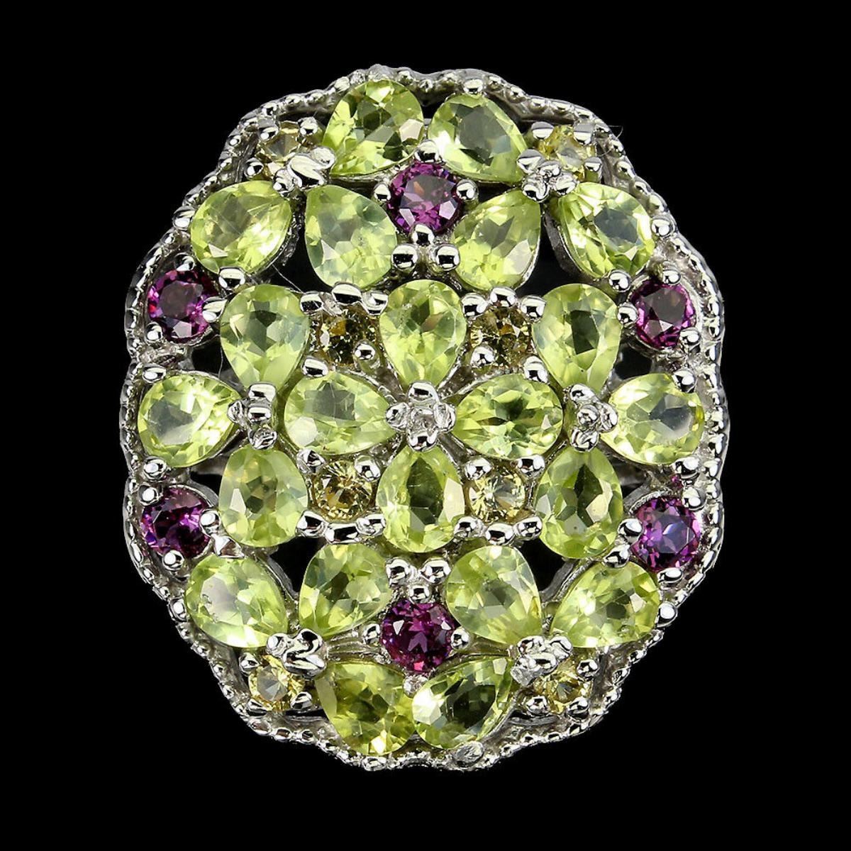 925 STERLING SILVER;PLATE-14K WHITE GOLD;RING SIZE-8(RESIZABLE);MAIN STONE-PERIDOT;OTHER GEMS-RHODOLITE GARNET, SAPPHIRE;TOTAL WEIGHT-6.48 GRAM (TOTAL WEIGHT OF SILVER + STONE);DIMENSION-* STONE 2.0 TO 4.0 X 3.0 MM. * RING SIZE 8.0 * FACE RING 25.0 X 21.0 MM.;MAIN STONE SHAPE-PEAR ;MAIN STONE COLOR- GREEN;CLARITY/GRADE-IF TO VVS;TREATMENT-UNHEATED;ORIGIN-PAKISTAN;HARDNESS-6.5 - 7.0;