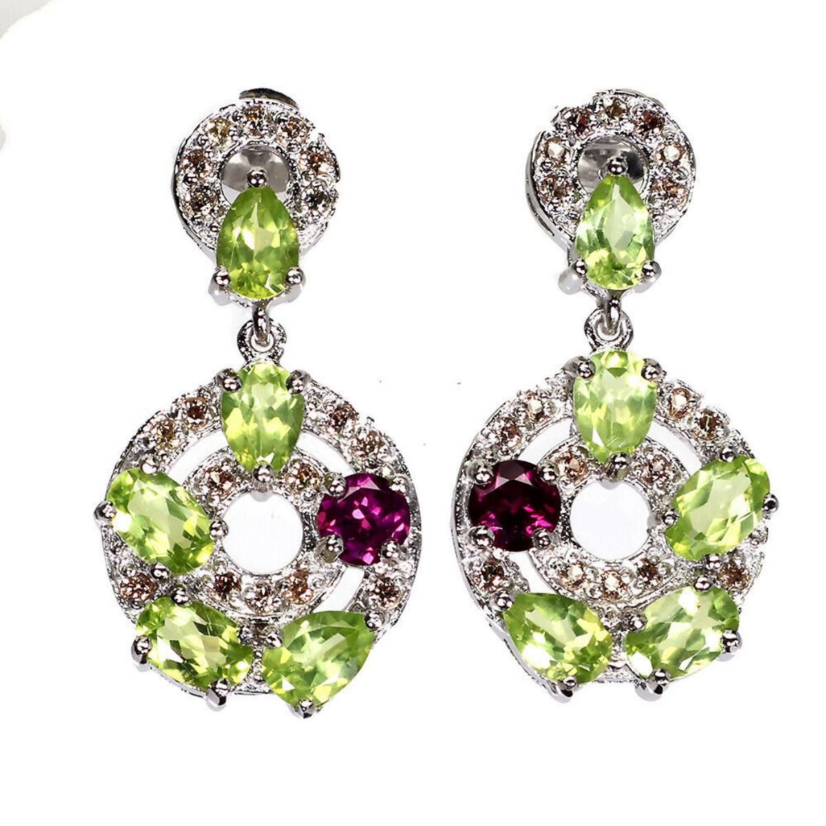 925 STERLING SILVER;PLATE-14K WHITE GOLD;MAIN STONE-PERIDOT;OTHER GEMS-RHODOLITE GARNET, SAPPHIRE;TOTAL WEIGHT-7.45 GRAM (TOTAL WEIGHT OF SILVER + STONE);DIMENSION-* STONE 1.5 TO 6.0 X 4.0 MM.* FACE EARRINGS 31.0 X 16.0 MM.;MAIN STONE SHAPE-OVAL CUT;MAIN STONE COLOR- GREEN;CLARITY/GRADE-IF TO VVS;TREATMENT-UNHEATED;ORIGIN-PAKISTAN;HARDNESS-6.5 - 7.0;