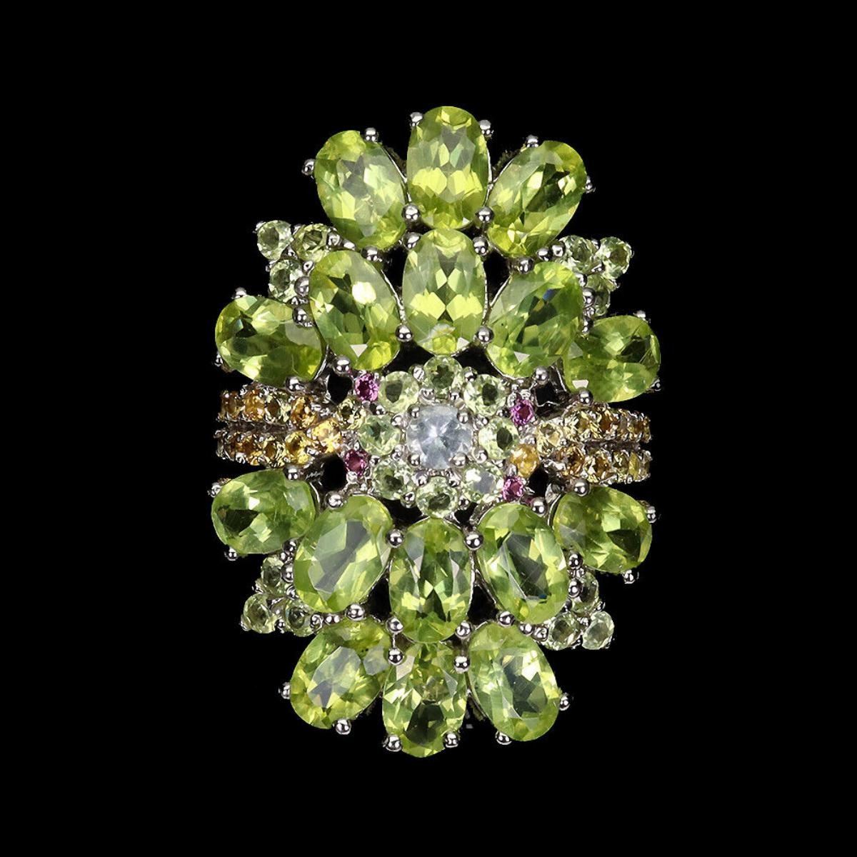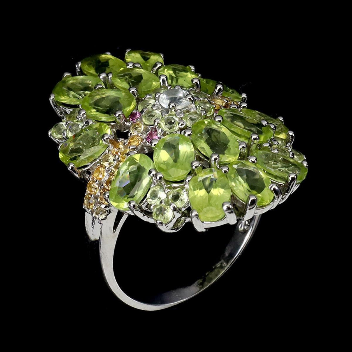 925 STERLING SILVER;PLATE-14K WHITE GOLD;RING SIZE/resizable-8;MAIN STONE-PERIDOT;OTHER GEMS-AQUAMARINE, RHODOLITE GARNET, SAPPHIRE;TOTAL WEIGHT-7.65 GRAM (TOTAL WEIGHT OF SILVER + STONE)DIMENSION-* STONE 1.0 TO 6.0 X 4.0 MM. * RING SIZE 8.0 * FACE RING- 32.0 X 22.0 MM.;MAIN STONE SHAPE-OVAL CUT;MAIN STONE COLOR- GREEN;CLARITY/GRADEIF TO VVS;TREATMENT-UNHEATED;ORIGIN-PAKISTAN;HARDNESS-6.5 - 7.0;