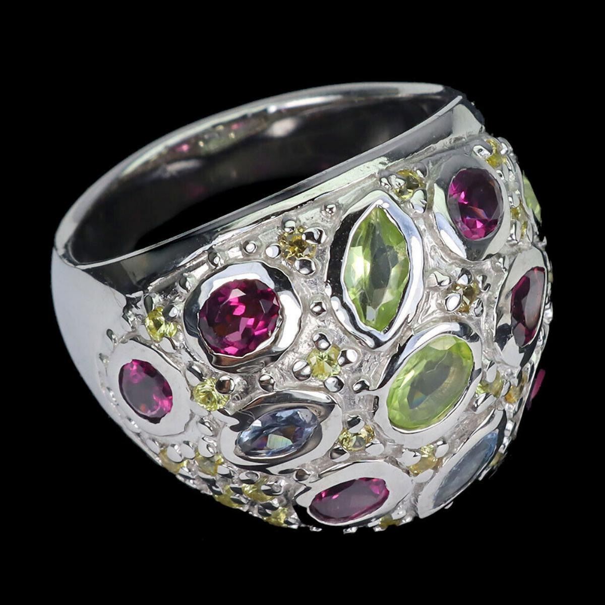 925 STERLING SILVER;PLATE-14K WHITE GOLD;RING SIZE/Resizable-8;MAIN STONE-PERIDOT;OTHER GEMS-RHODOLITE GARNET, SAPPHIRE, TANZANITE;TOTAL WEIGHT-9.2 GRAM (TOTAL WEIGHT OF SILVER + STONE)DIMENSION-* STONE 1.5 TO 6.0 X 3.0 MM. * RING SIZE 8.0 * FACE RING- 22.0 X 19.0 MM.;MAIN STONE SHAPE-OVAL CUT;MAIN STONE COLOR-GREEN;CLARITY/GRADE-IF TO VVS;TREATMENT-UNHEATED;ORIGIN-PAKISTAN;HARDNESS-6.5 - 7.0;