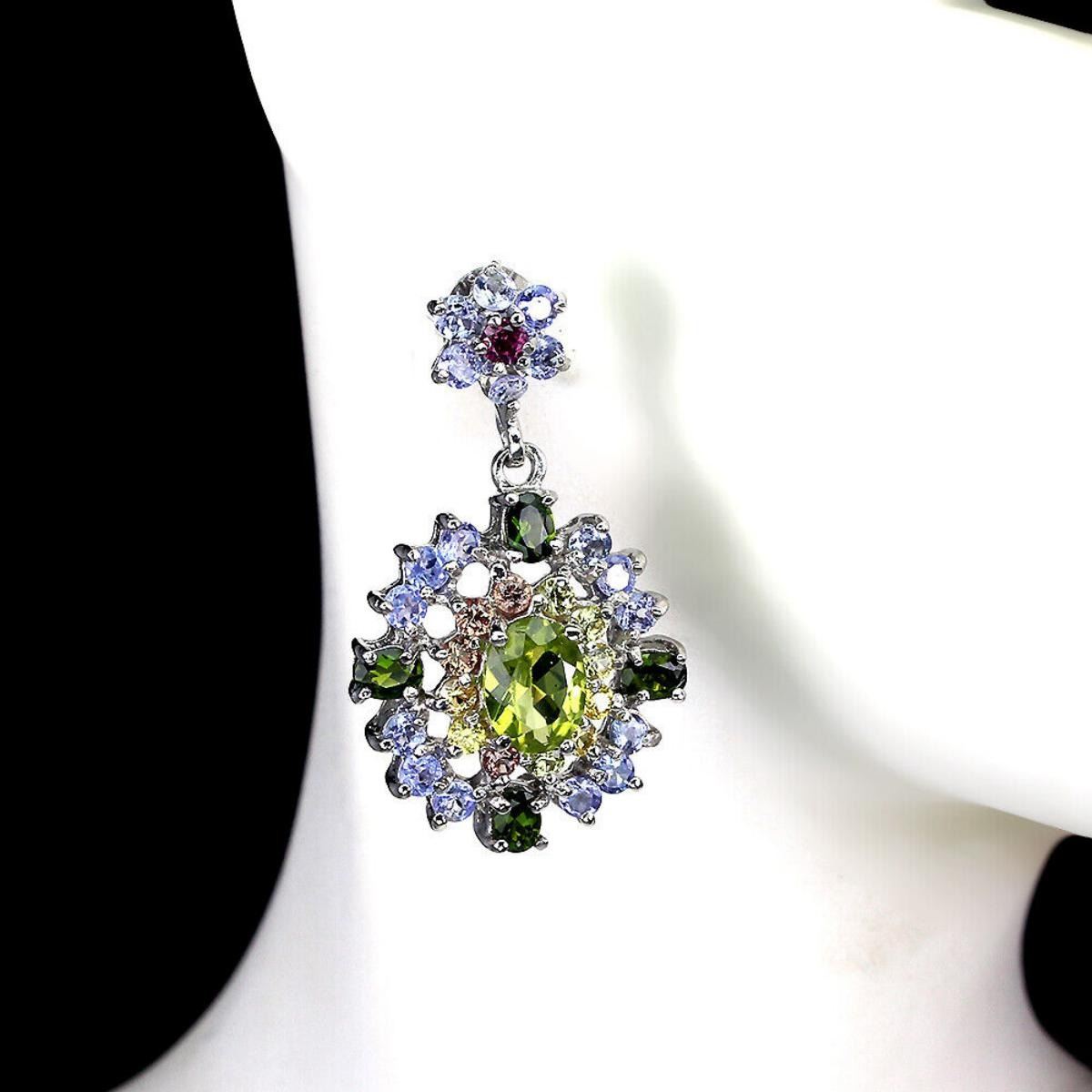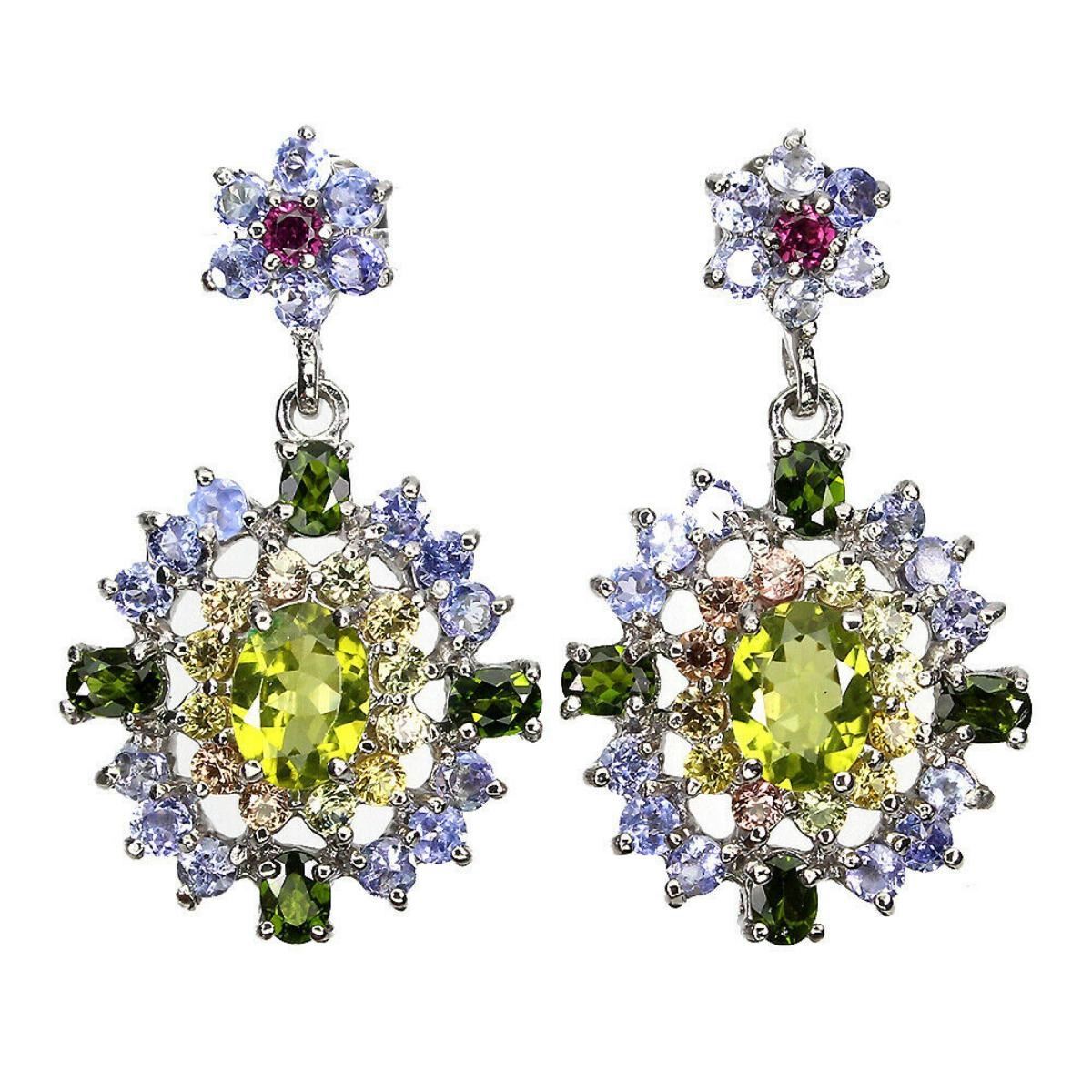 925 STERLING SILVER;PLATE-14K WHITE GOLD;MAIN STONE-PERIDOT;OTHER GEMS-KYANITE, RHODOLITE GARNET, SAPPHIRE, TANZANITE;TOTAL WEIGHT-11.45 GRAM (TOTAL WEIGHT OF SILVER + STONE);DIMENSION-* STONE 2.0 TO 8.0 X 6.0 MM.;* FACE EARRINGS- 35.0 X 20.0 MM.;MAIN STONE SHAPE-OVAL CUT;CLARITY/GRADE-IF TO VVS;TREATMENT-UNHEATED;ORIGIN-PAKISTAN;HARDNESS-6.5 - 7.0;