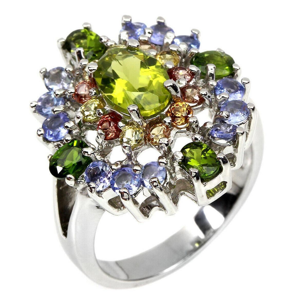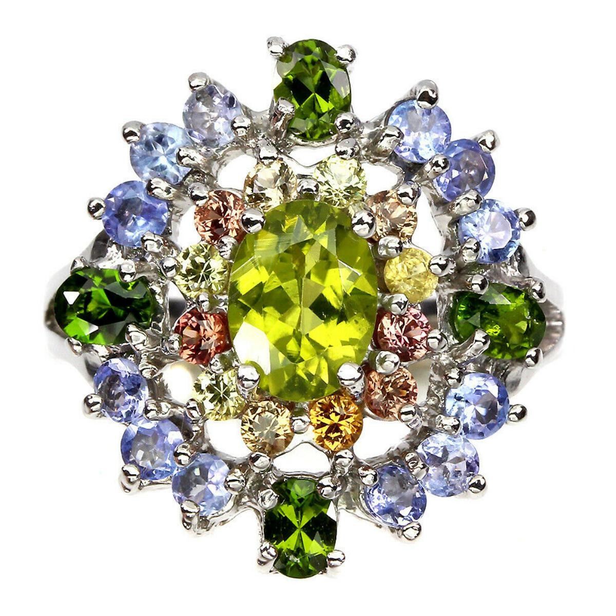 925 STERLING SILVER;PLATE-14K WHITE GOLD;RING SIZE/Resizeable-8;MAIN STONE-PERIDOT;OTHER GEMS-CHROME DIOPSIDE, SAPPHIRE, TANZANITE;TOTAL WEIGHT-7.92 GRAM (TOTAL WEIGHT OF SILVER + STONE)DIMENSION-* STONE 2.0 TO 8.0 X 6.0 MM.* FACE RING- 22.0 X 20.0 MM.;MAIN STONE SHAPE-OVAL CUT;CLARITY/GRADE-IF TO VVS;TREATMENT-UNHEATED;ORIGIN-PAKISTAN;HARDNESS-6.5 - 7.0;