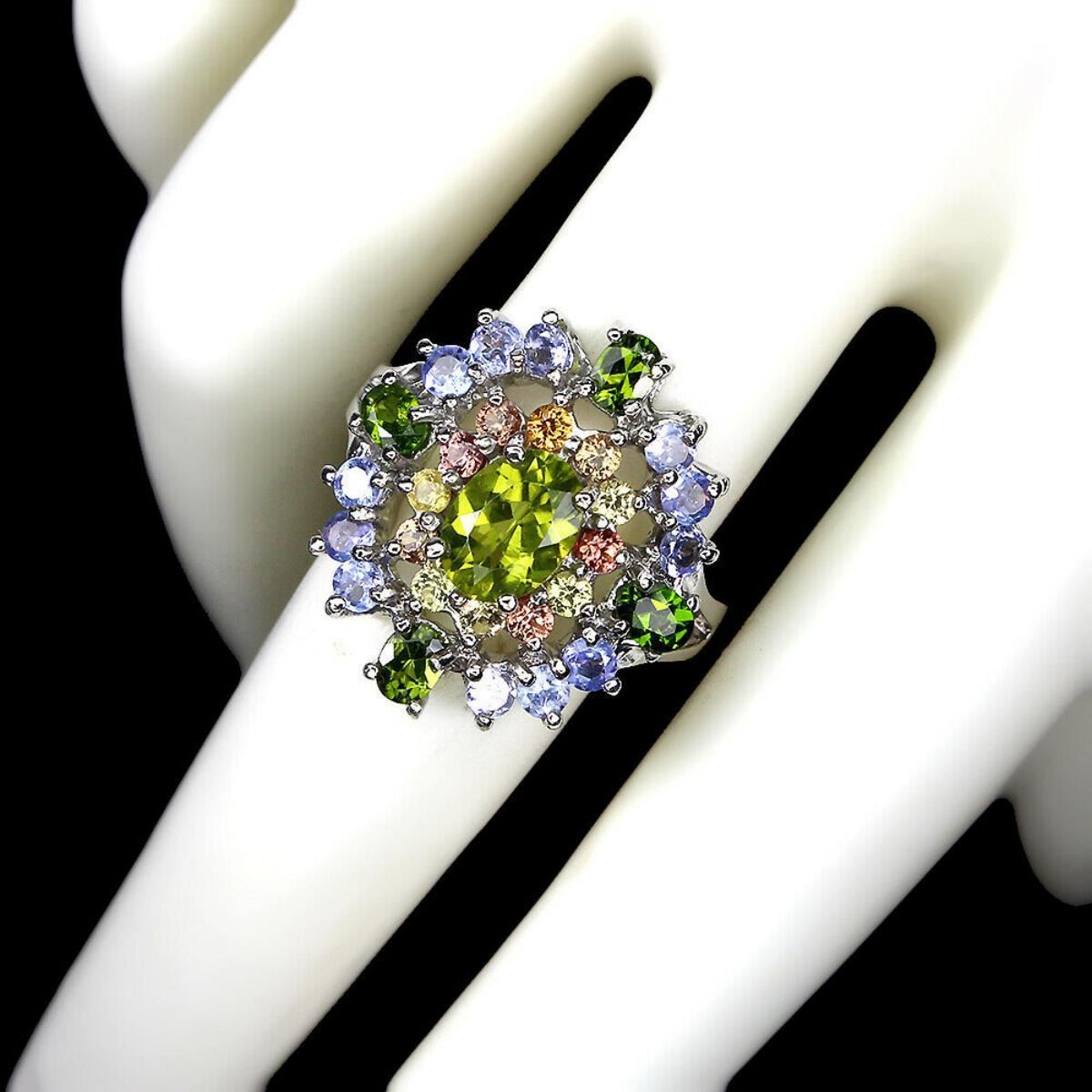925 STERLING SILVER;PLATE-14K WHITE GOLD;RING SIZE/Resizeable-8;MAIN STONE-PERIDOT;OTHER GEMS-CHROME DIOPSIDE, SAPPHIRE, TANZANITE;TOTAL WEIGHT-7.92 GRAM (TOTAL WEIGHT OF SILVER + STONE)DIMENSION-* STONE 2.0 TO 8.0 X 6.0 MM.* FACE RING- 22.0 X 20.0 MM.;MAIN STONE SHAPE-OVAL CUT;CLARITY/GRADE-IF TO VVS;TREATMENT-UNHEATED;ORIGIN-PAKISTAN;HARDNESS-6.5 - 7.0;