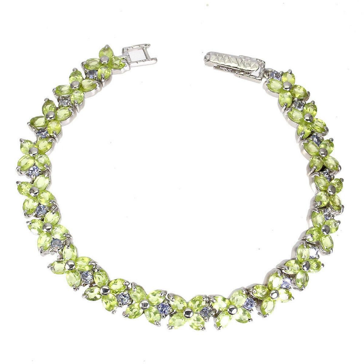 925 STERLING SILVER;PLATE-14K WHITE GOLD;LENGTH (INCHES)-7.5;MAIN STONE-PERIDOT;OTHER GEMS-TANZANITE;TOTAL WEIGHT-20.79 GRAM (TOTAL WEIGHT OF SILVER + STONE);DIMENSION-* STONE 2.5 TO 4.0 X 3.0 MM.* LENGTH 7.5 INCHES.* FACE BRACELET 160.0 X 8.0 MM.;MAIN STONE SHAPE-PEAR CUT;MAIN STONE COLOR-GREEN;CLARITY/GRADE-IF;TREATMENT-UNHEATED;ORIGIN-PAKISTAN;HARDNESS-6.5 - 7.0;