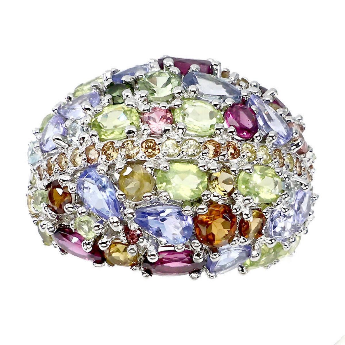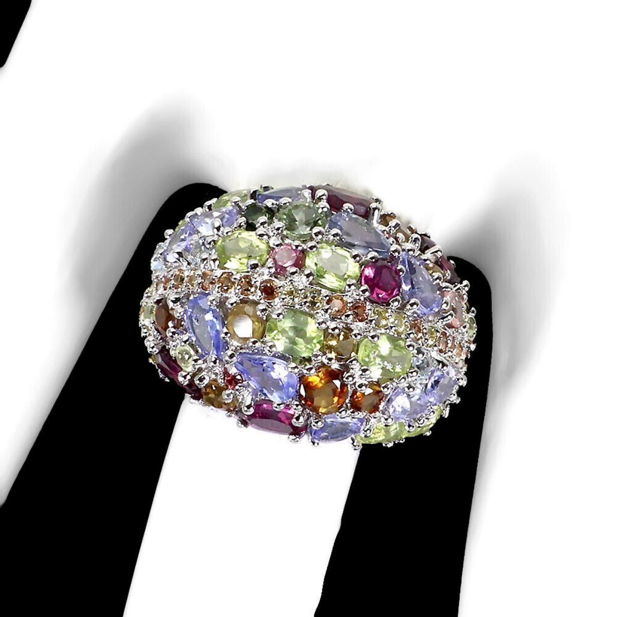 925 STERLING SILVER;PLATE-14K WHITE GOLD;RING SIZE/resizable-9;MAIN STONE-PERIDOT;OTHER GEMS-RHODOLITE GARNET, SAPPHIRE, TANZANITE, TOURMALINE;TOTAL WEIGHT-7.66 GRAM (TOTAL WEIGHT OF SILVER + STONE)DIMENSION-* STONE 1.5 TO 5.0 X 3.0 MM.;* FACE RING- 24.0 X 19.0 MM.;;MAIN STONE SHAPE-OVAL CUT;MAIN STONE COLOR-TOP RICH GREEN;CLARITY/GRADE-IF TO VVS;TREATMENT-UNHEATED;ORIGIN-PAKISTAN;HARDNESS-6.5 - 7.0;
