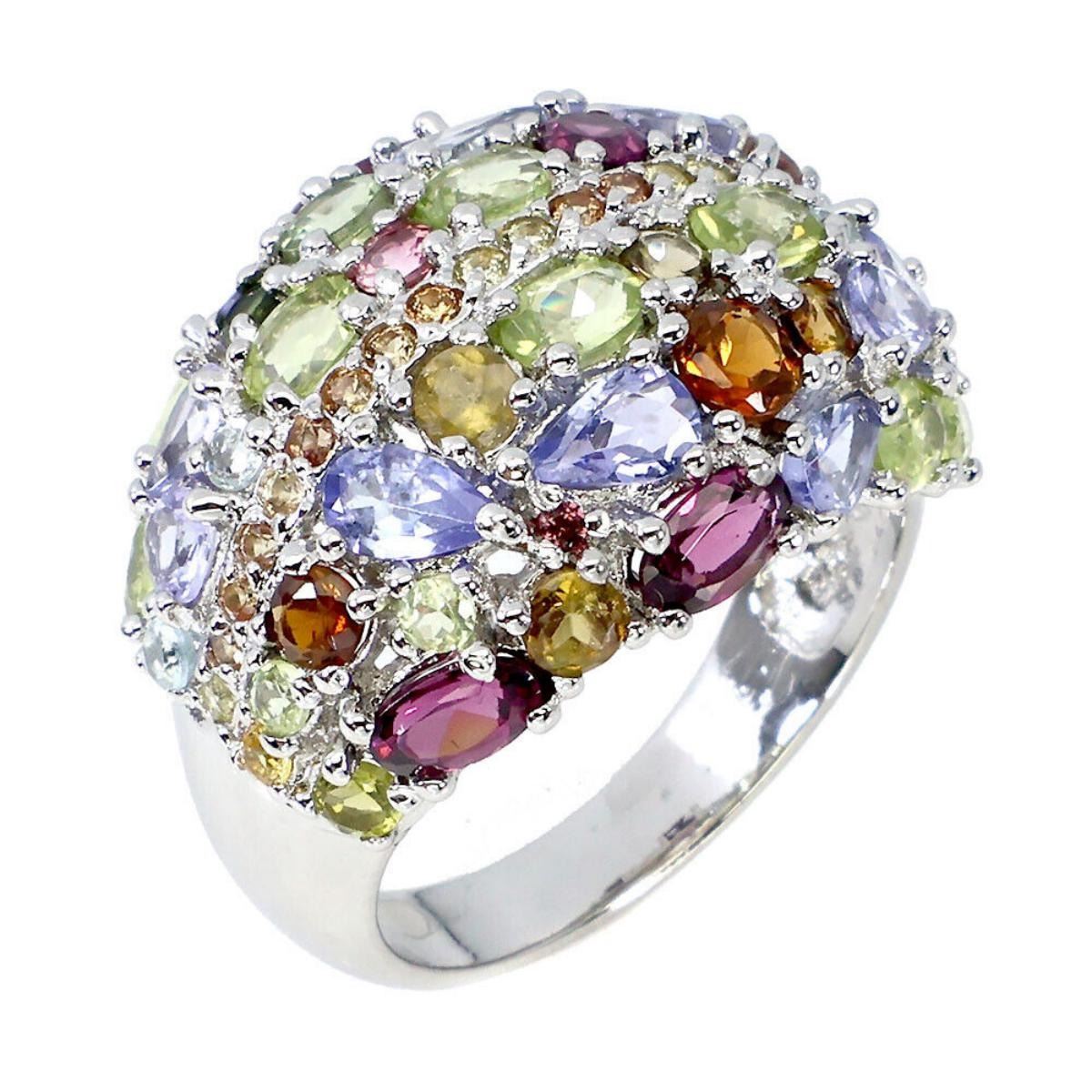 925 STERLING SILVER;PLATE-14K WHITE GOLD;RING SIZE/resizable-9;MAIN STONE-PERIDOT;OTHER GEMS-RHODOLITE GARNET, SAPPHIRE, TANZANITE, TOURMALINE;TOTAL WEIGHT-7.66 GRAM (TOTAL WEIGHT OF SILVER + STONE)DIMENSION-* STONE 1.5 TO 5.0 X 3.0 MM.;* FACE RING- 24.0 X 19.0 MM.;;MAIN STONE SHAPE-OVAL CUT;MAIN STONE COLOR-TOP RICH GREEN;CLARITY/GRADE-IF TO VVS;TREATMENT-UNHEATED;ORIGIN-PAKISTAN;HARDNESS-6.5 - 7.0;