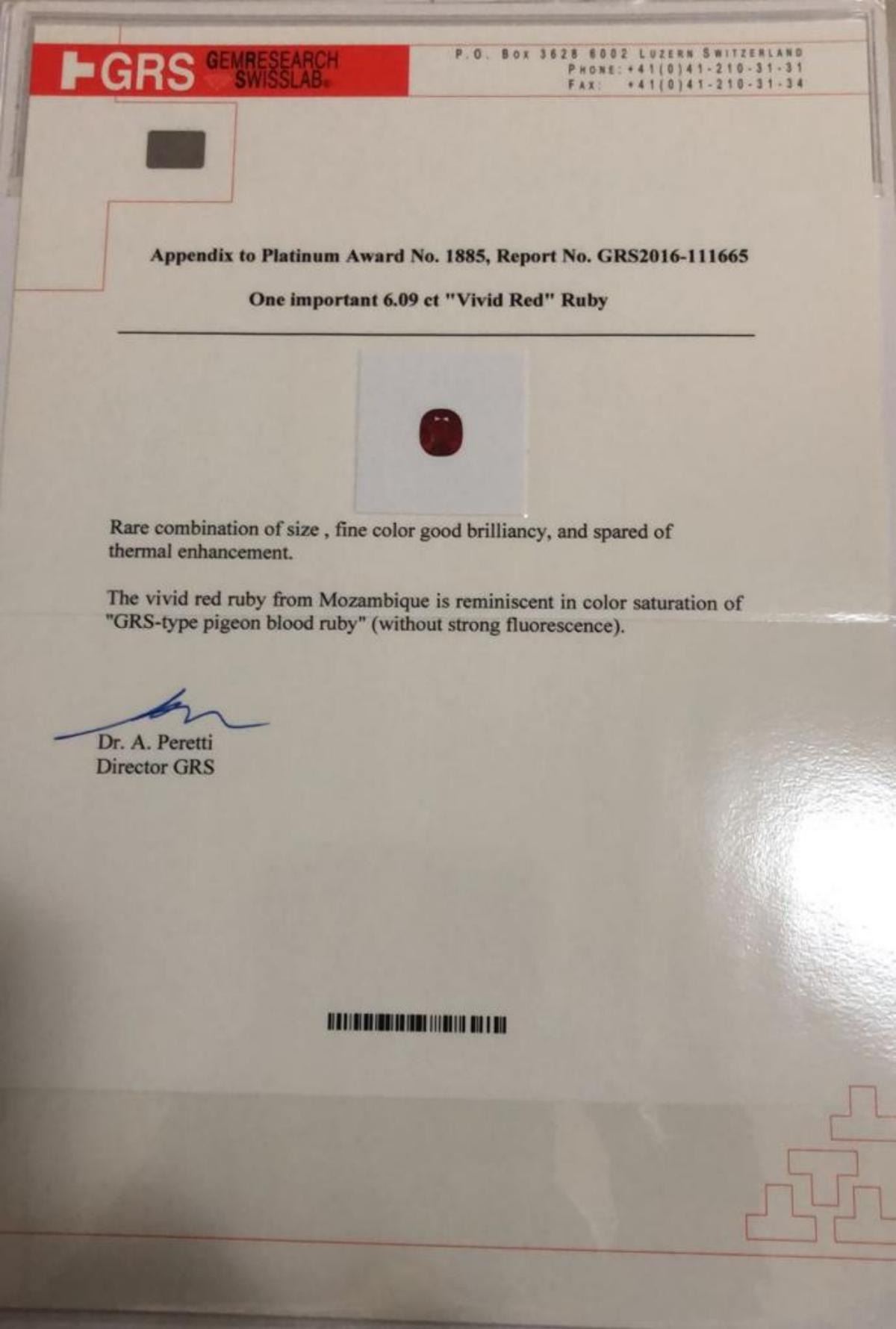 Natural Pigeon Blood Red Award Winning Ruby; Shape - Cushion Cut; Weight - 6.09 Cts ; Size - 11.11 x 9.90 x 5.97 MM; Color - Pigeon Blood Red'; Clarity - VVS .....Completely Eye Clean; Completely untreated in any way; Platinum Award winning Ruby; GRS swiss lab Certified