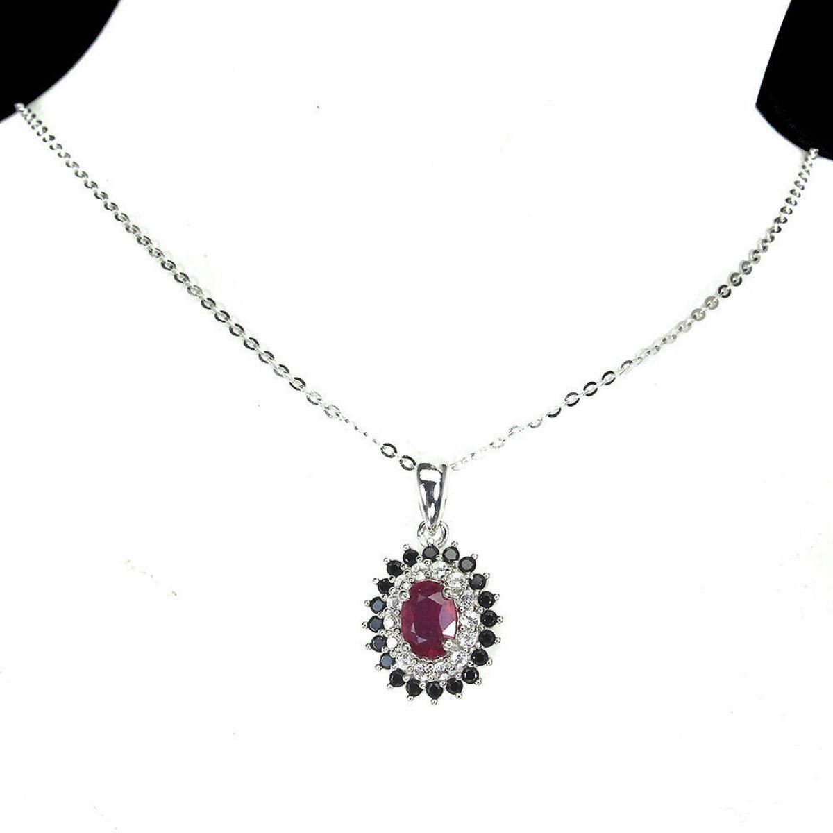 925 STERLING SILVER;PLATE-14K WHITE GOLD;LENGTH (INCHES)-18;MAIN STONE-RUBY;OTHER GEMS-BLACK SPINEL, WHITE TOPAZ;TOTAL WEIGHT-3.15 GRAM (TOTAL WEIGHT OF SILVER + STONE);DIMENSION-* STONE 1.5 TO 7.0 X 5.0 MM.* TOTAL LENGTH 18.0 INCHES.* STONES PART LENGTH 21.0 X 12.0 MM.;MAIN STONE SHAPE-OVAL; MAIN STONE COLOR-PIGEON BLOOD RED;TREATMENT-YES;ORIGIN-MADAGASCAR;HARDNESS-9;