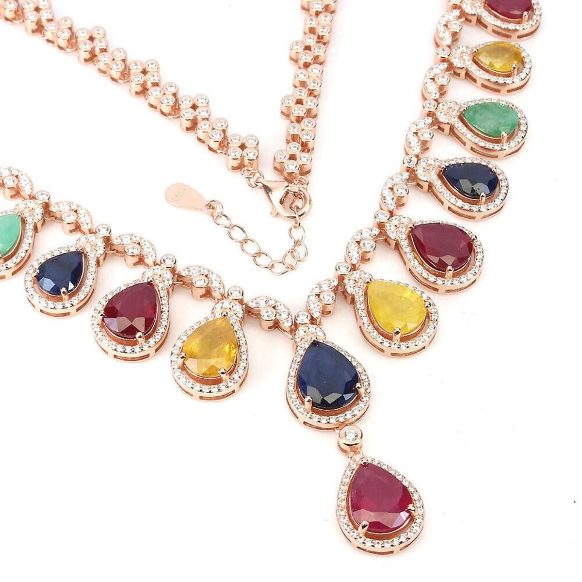 925 STERLING SILVER;PLATE-14K ROSE GOLD;LENGTH (INCHES)18;MAIN STONE-RUBY;OTHER GEMS-- EMERALD, SAPPHIRE;TOTAL WEIGHT-40.8 GRAM (TOTAL WEIGHT OF SILVER + STONE)DIMENSION-* STONE 7.0 X 5.0 TO 10.0 X 8.0 MM.;* TOTAL LENGTH- 18.0 INCHES.;* STONES PART LENGTH- 440.0 X 35.0 MM.;MAIN STONE SHAPE-PEAR CUT;MAIN STONE COLOR-TOP BLOOD RED;TREATMENT- Yes;ORIGIN-MADAGASCAR;HARDNESS-9;