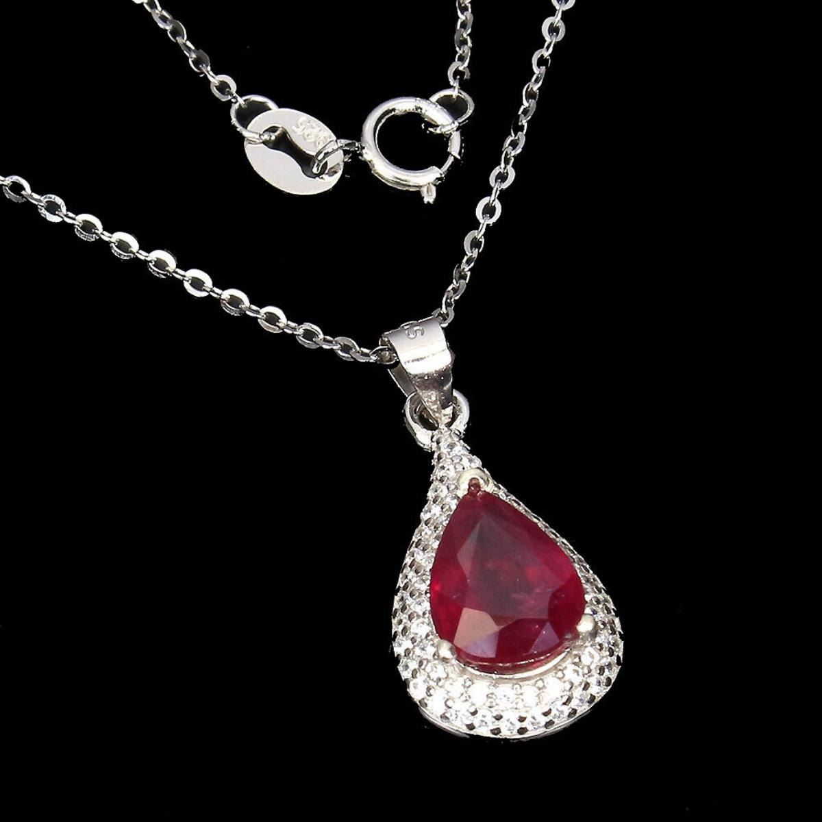 925 STERLING SILVER;PLATE-14K WHITE GOLD;LENGTH (INCHES)-18;MAIN STONE-RUBY;TOTAL WEIGHT-2.94 GRAM (TOTAL WEIGHT OF SILVER + STONE);DIMENSION-* STONE 9.0 X 7.0 MM.* TOTAL LENGTH 18.0 INCHES.* STONES PART LENGTH 23.0 X 11.0 MM.;MAIN STONE SHAPE-PEAR;MAIN STONE COLOR-PIGEON BLOOD RED;TREATMENT-YES;ORIGIN-MADAGASCAR;HARDNESS-9;