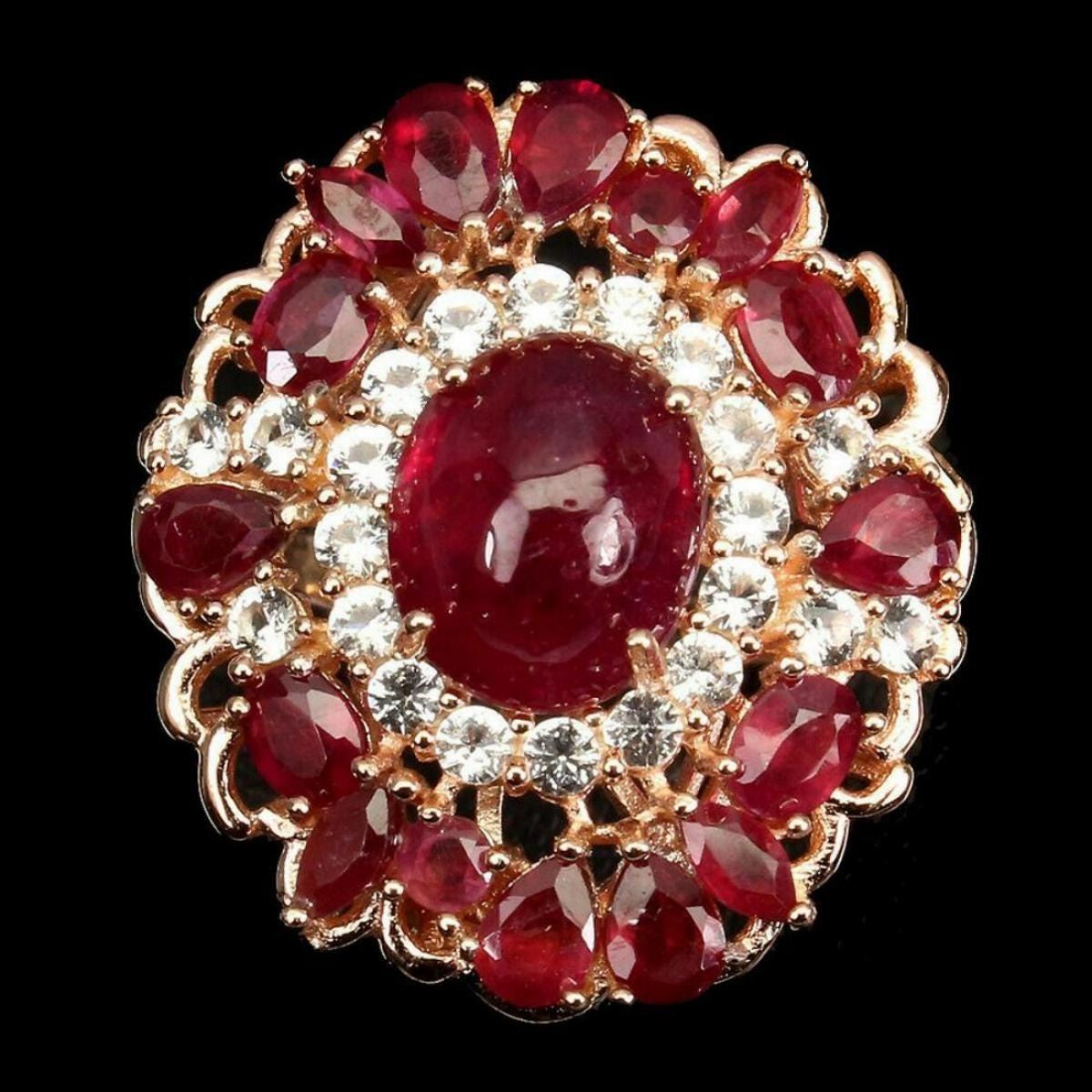 925 STERLING SILVER;PLATE-14K ROSE GOLD;RING SIZE -9 (Resizeable);MAIN STONE-RUBY;TOTAL WEIGHT-6.75 GRAM (TOTAL WEIGHT OF SILVER + STONE)DIMENSION-* STONE 2.5 TO 9.0 X 7.0 MM. * CZ 2.0 MM. * RING SIZE 9.0 * FACE RING 25.0 X 22.0 MM.;MAIN STONE SHAPE-OVAL CABOCHON;MAIN STONE COLOR-TOP BLOOD RED;TREATMENT-- Yes;ORIGIN-MADAGASCAR;HARDNESS-9.0;