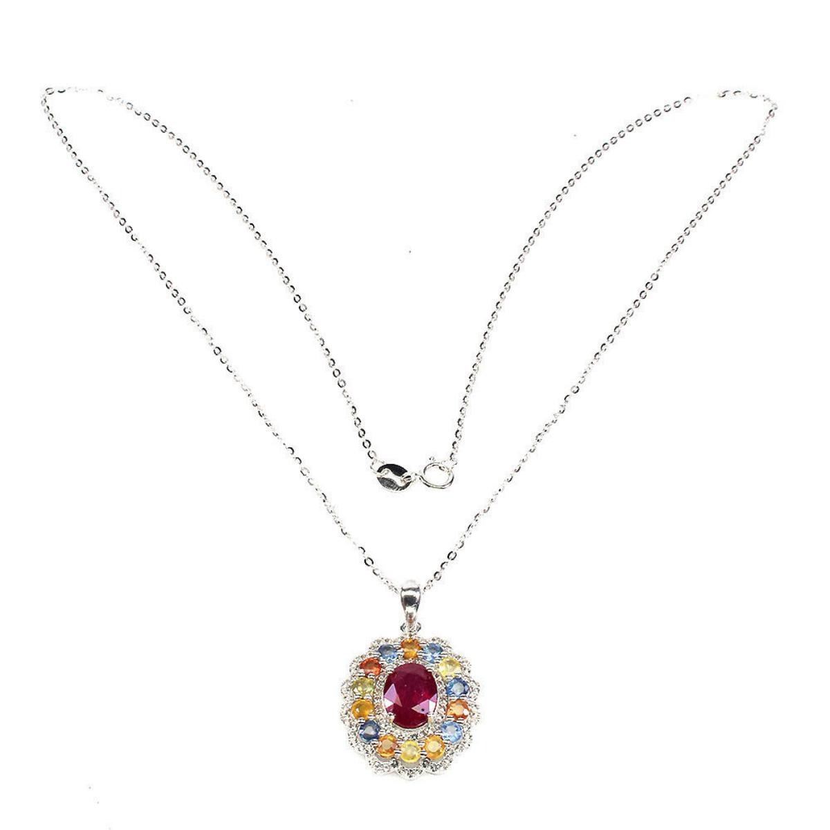 925 STERLING SILVER;PLATE-14K WHITE GOLD;LENGTH (INCHES)18;MAIN STONE-RUBY;OTHER GEMS-SAPPHIRE, WHITE TOPAZ;TOTAL WEIGHT-4.36 GRAM (TOTAL WEIGHT OF SILVER + STONE)DIMENSION-* STONE 1.0 TO 9.0 X 7.0 MM.;* TOTAL LENGTH- 18.0 INCHES.;* STONES PART LENGTH -28.0 X 18.0 MM.;MAIN STONE SHAPE-OVAL CUT;MAIN STONE COLOR-BLOOD RED;TREATMENT-yes;ORIGIN-MADAGASCAR;HARDNESS-9.0;