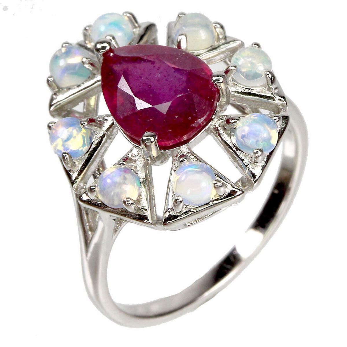 925 STERLING SILVER;PLATE-14K WHITE GOLD;RING SIZE-8(RESIZABLE);MAIN STONE-RUBY;OTHER GEMS-OPAL;TOTAL WEIGHT-4.34 GRAM (TOTAL WEIGHT OF SILVER + STONE);DIMENSION-* STONE 3.0 TO 9.0 X 7.0 MM.* RING SIZE 8.0* FACE RING 19.0 X 17.0 MM.;MAIN STONE SHAPE-PEAR ;MAIN STONE COLOR-PIGEON BLOOD RED;TREATMENT-YES;ORIGIN-MADAGASCAR;HARDNESS-9;