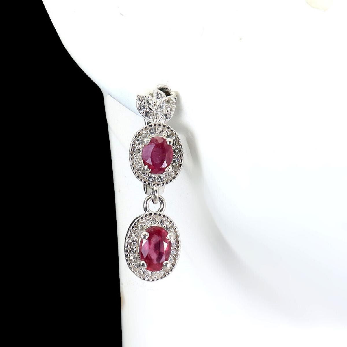 925 STERLING SILVER;PLATE-14K WHITE GOLD;MAIN STONE-RUBY;OTHER GEMS-WHITE TOPAZ;TOTAL WEIGHT-3.74 GRAM (TOTAL WEIGHT OF SILVER + STONE);DIMENSION-* STONE 1.0 TO 6.0 X 4.0 MM.* FACE EARRINGS 25.0 X 7.0 MM.;MAIN STONE SHAPE-OVAL; MAIN STONE COLOR- PIGEON BLOOD RED;TREATMENT- YES;ORIGIN-MADAGASCAR;HARDNESS-9.0;