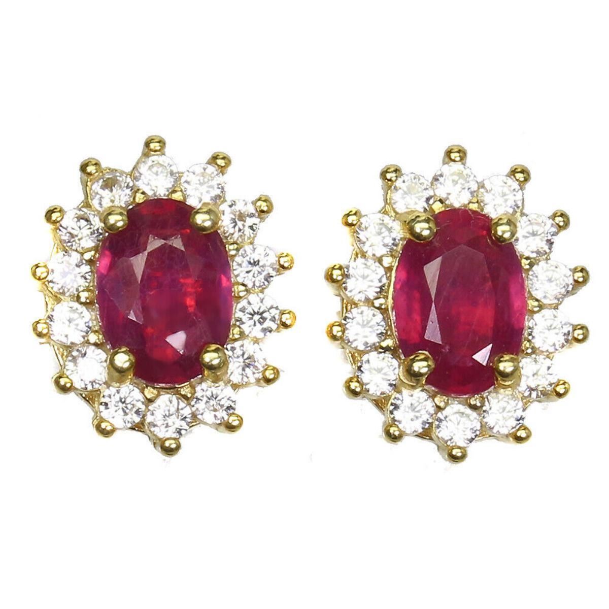 925 STERLING SILVER;PLATE-14K YELLOW GOLD;MAIN STONE-RUBY;OTHER GEMS-WHITE TOPAZ;TOTAL WEIGHT-2.55 GRAM (TOTAL WEIGHT OF SILVER + STONE)DIMENSION-* STONE 1.5 TO 7.0 X 5.0 MM.;* FACE EARRINGS- 12.0 X 10.0 MM.;MAIN STONE SHAPE-OVAL CUT;MAIN STONE COLOR- BLOOD RED;TREATMENT-Yes;ORIGIN-MADAGASCAR;HARDNESS-9;