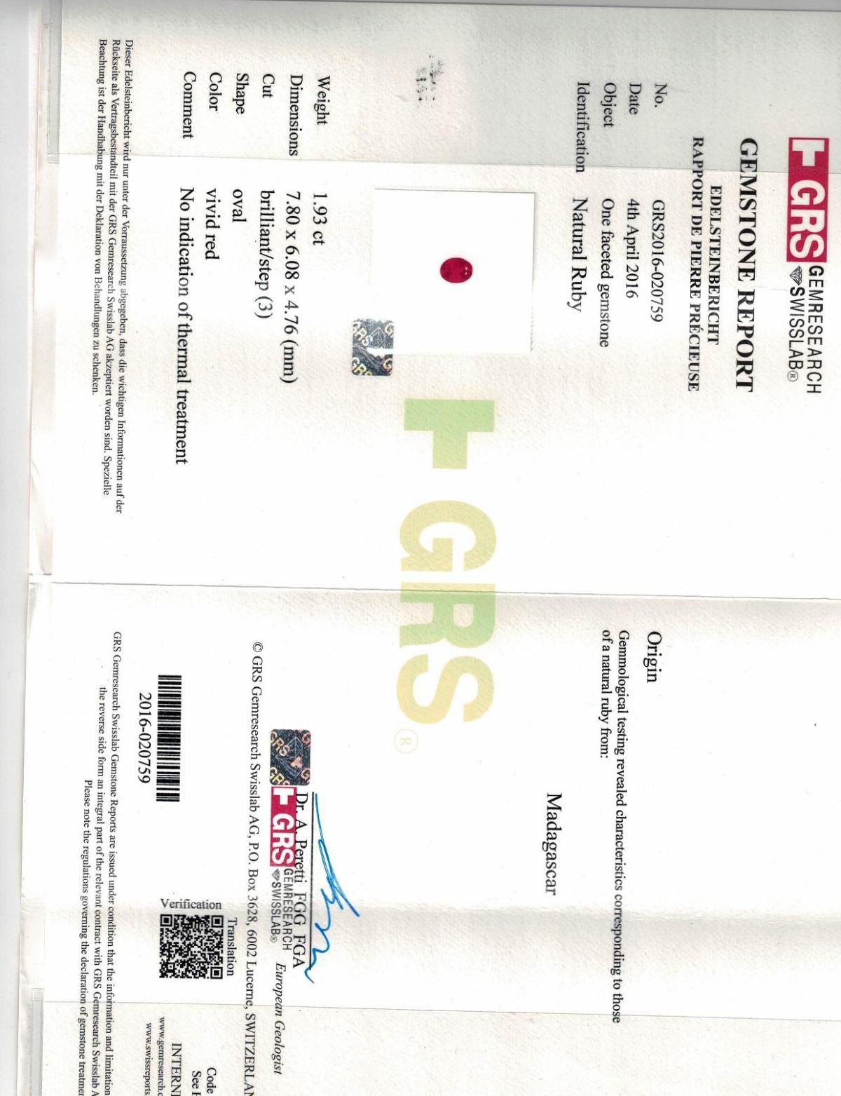 Natural Pigeon Blood Red 1.93 Carats Ruby - GRS certified.....completely untreated.....eye clean......color - Vivid red or Pigeon Blood red. Shape - Oval