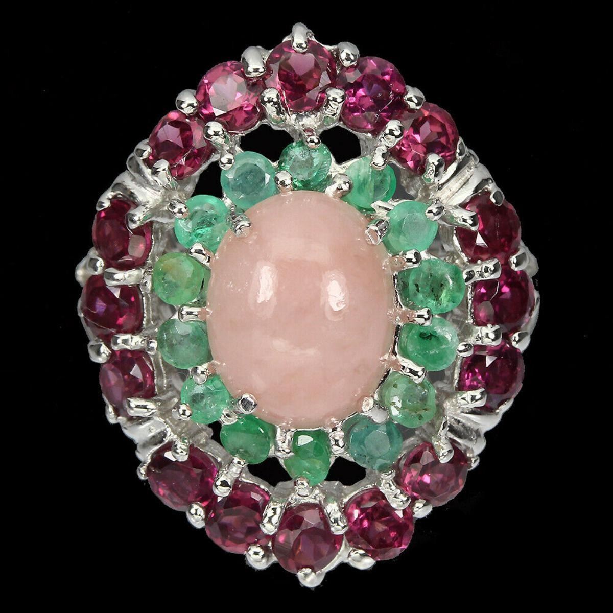 925 STERLING SILVER;PLATE-14K WHITE GOLD;RING SIZE-7(resizeable)MAIN STONE-PINK OPAL;OTHER GEMS-EMERALD, RHODOLITE GARNET;TOTAL WEIGHT-6.84 GRAM (TOTAL WEIGHT OF SILVER + STONE)DIMENSION-* STONE 2.0 TO 10.0 X 8.0 MM. * RING SIZE 7.0 * FACE RING- 24.0 X 20.0 MM.;MAIN STONE SHAPE-OVAL CABOCHON;MAIN STONE COLOR-TOP NICE PINK;TREATMENT-UNHEATED;ORIGIN-ETHIOPIA;