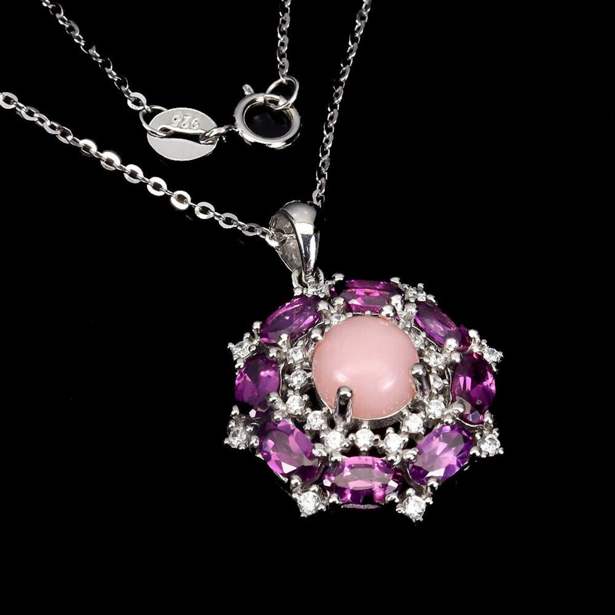 925 STERLING SILVER;PLATE-14K WHITE GOLD;LENGTH (INCHES)18;MAIN STONE-PINK OPAL;OTHER GEMS- RHODOLITE GARNET;TOTAL WEIGHT-4.36 GRAM (TOTAL WEIGHT OF SILVER + STONE)DIMENSION-* STONE 5.0 X 3.0 TO 7.0 MM.;* TOTAL LENGTH- 18.0 INCHES.;* STONES PART LENGTH- 26.0 X 20.0 MM.;MAIN STONE SHAPEROUND CABOCHON;MAIN STONE COLOR- PINK;TREATMENT-UNHEATED;ORIGIN-ETHIOPIA;HARDNESS-5.5 - 6.5;