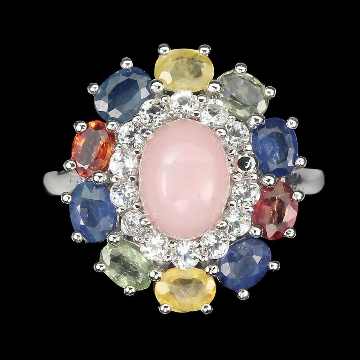 925 STERLING SILVER;PLATE-14K WHITE GOLD;RING SIZE/resizable-8;MAIN STONE-PINK OPAL;OTHER GEMS-SAPPHIRE, WHITE TOPAZ;TOTAL WEIGHT-4.37 GRAM (TOTAL WEIGHT OF SILVER + STONE)DIMENSION* STONE 2.0 TO 8.0 X 6.0 MM.;** FACE RING -19.0 X 17.0 MM.;MAIN STONE SHAPE-OVAL CABOCHON;MAIN STONE COLOR-TOP NICE PINK;TREATMENT-UNHEATED;ORIGIN-ETHIOPIA;HARDNESS-5.5 - 6.5;