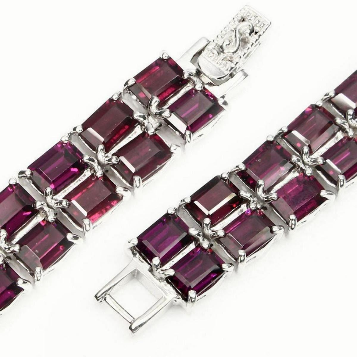 925 STERLING SILVER;PLATE14K WHITE GOLD;LENGTH (INCHES)7.5;MAIN STONERHODOLITE GARNETOTHER GEMSTOTAL WEIGHT167.42 CT (TOTAL WEIGHT OF SILVER + STONE)DIMENSION* STONE 7.0 X 5.0 MM. * FACE BRACELET 180.0 X 12.0 MM.MAIN STONE SHAPEOCTAGON CUTMAIN STONE COLORTOP RICH PINK RASPBERRYCLARITY/GRADEIF TO VVSLUSTERGLORIOUSTREATMENTUNHEATEDORIGINAFRICAHARDNESS7.0 - 7.5