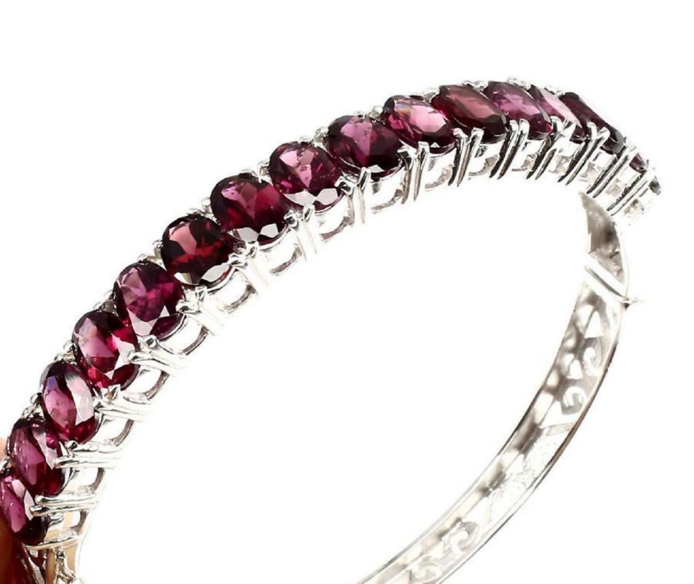 925 STERLING SILVER; PLATE.... 14K WHITE GOLD; MAIN STONE -RHODOLITE GARNET; TOTAL WEIGHT 84.73 CT (TOTAL WEIGHT OF SILVER + STONE) DIMENSION * STONE 7.0 X 5.0 MM. * DIAMETER 2.2 X 2.1 INCHES. * FACE BANGLE 63.0 X 7.0 MM. MAIN STONE SHAPE OVAL CUT MAIN STONE COLOR TOP RICH PINK RASPBERRY CLARITY/GRADE IF TO VVS LUSTER GORGEOUS TREATMENT UNHEATED ORIGIN AFRICA HARDNESS 7.0 - 7.5