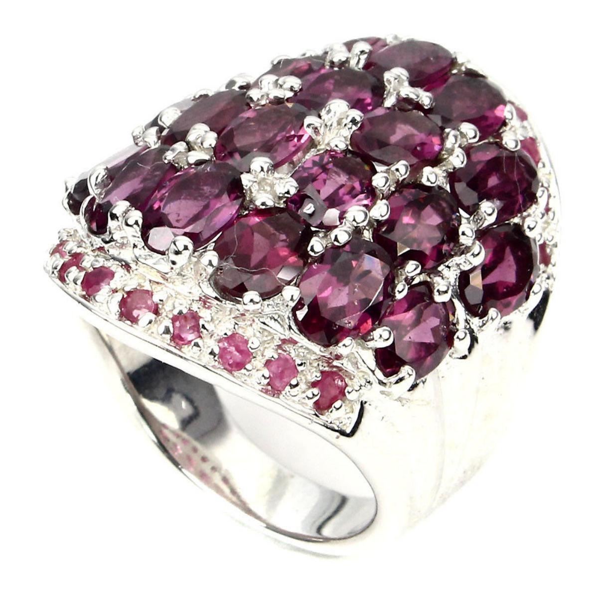 925 STERLING SILVER; PLATE -14K WHITE GOLD; RING SIZE/LENGTH (INCHES)- 8; MAIN STONE -RHODOLITE GARNET; OTHER GEMS -RUBY; TOTAL WEIGHT -81.81 CT (TOTAL WEIGHT OF SILVER + STONE) DIMENSION * STONE 2.0 TO 6.0 X 4.0 MM. * RING SIZE 8.0 * FACE RING 30.0 X 23.0 MM.; MAIN STONE SHAPE -OVAL CUT; MAIN STONE COLOR -TOP RICH PINK RASPBERRY; CLARITY/GRADE -IF TO VVS LUSTER GRACEFULLY TREATMENT UNHEATED ORIGIN AFRICA HARDNESS 7