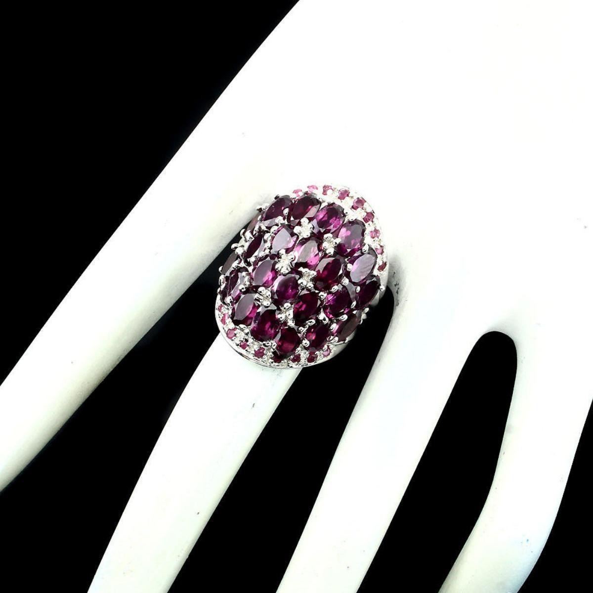 925 STERLING SILVER; PLATE -14K WHITE GOLD; RING SIZE/LENGTH (INCHES)- 8; MAIN STONE -RHODOLITE GARNET; OTHER GEMS -RUBY; TOTAL WEIGHT -81.81 CT (TOTAL WEIGHT OF SILVER + STONE) DIMENSION * STONE 2.0 TO 6.0 X 4.0 MM. * RING SIZE 8.0 * FACE RING 30.0 X 23.0 MM.; MAIN STONE SHAPE -OVAL CUT; MAIN STONE COLOR -TOP RICH PINK RASPBERRY; CLARITY/GRADE -IF TO VVS LUSTER GRACEFULLY TREATMENT UNHEATED ORIGIN AFRICA HARDNESS 7