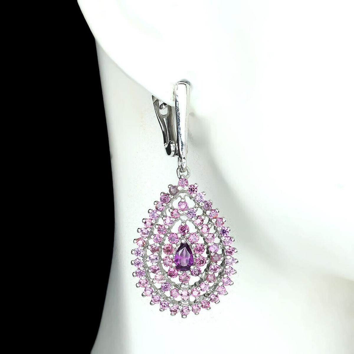 925 STERLING SILVER;PLATE-14K WHITE GOLD;MAIN STONE-RHODOLITE GARNET;TOTAL WEIGHT-6.8 GRAM (TOTAL WEIGHT OF SILVER + STONE)DIMENSION-* STONE 1.5 TO 6.0 X 4.0 MM.;* FACE EARRINGS- 35.0 X 15.0 MM.;MAIN STONE SHAPE-PEAR CUT;MAIN STONE COLOR- PINK RASPBERRY;CLARITY/GRADE-IF TO VVS;TREATMENT-UNHEATED;ORIGIN-AFRICA;HARDNESS-7.0 - 7.5;