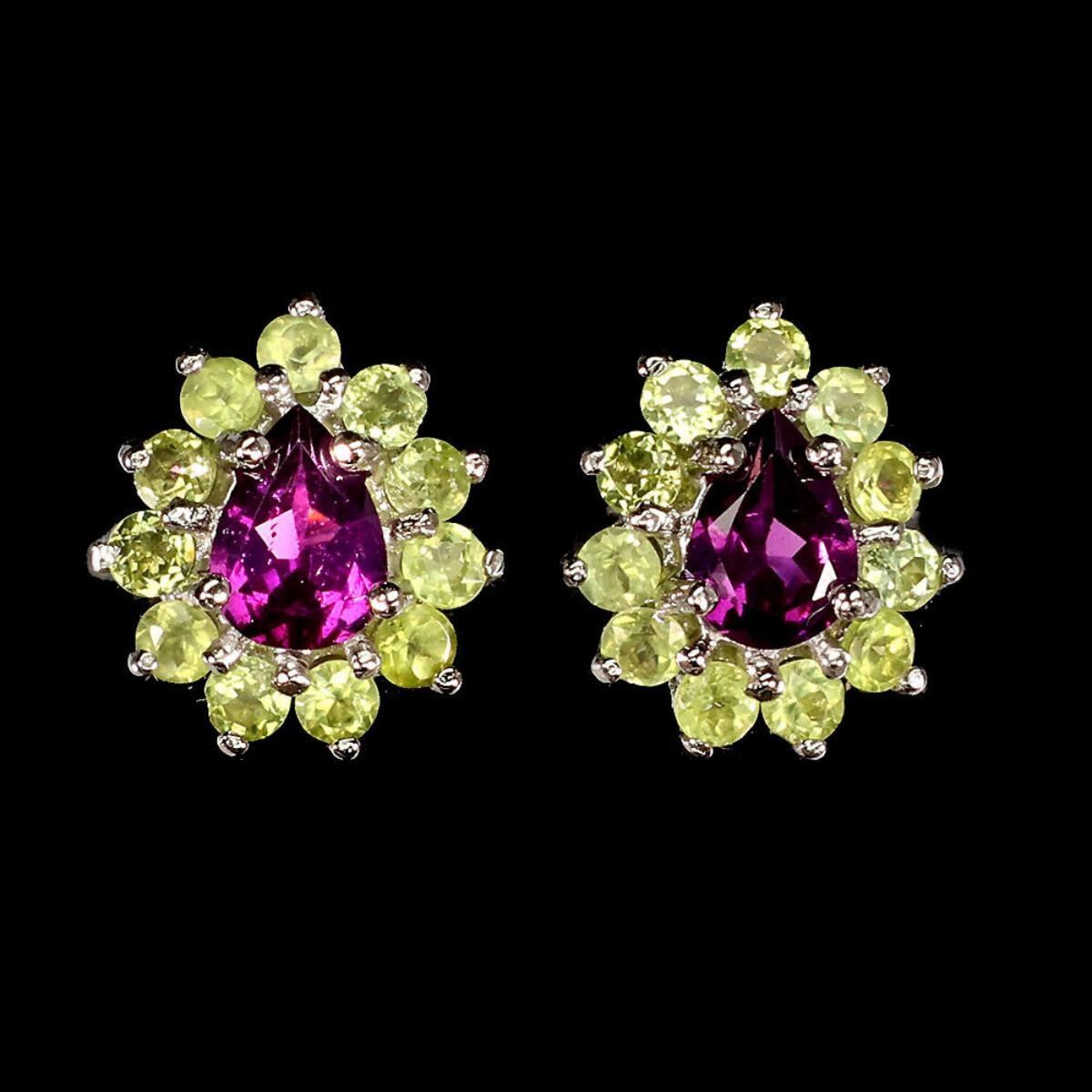 925 STERLING SILVER;PLATE-14K WHITE GOLD;MAIN STONE-RHODOLITE GARNET;OTHER GEMS-PERIDOT;TOTAL WEIGHT-4.45 GRAM (TOTAL WEIGHT OF SILVER + STONE);DIMENSION-* STONE 3.0 TO 7.0 X 5.0 MM.* FACE EARRINGS 13.0 X 11.0 MM.;MAIN STONE SHAPE-PEAR; MAIN STONE COLOR-PINK RASPBERRY;CLARITY/GRADE-IF TO VVS;TREATMENT-UNHEATED;