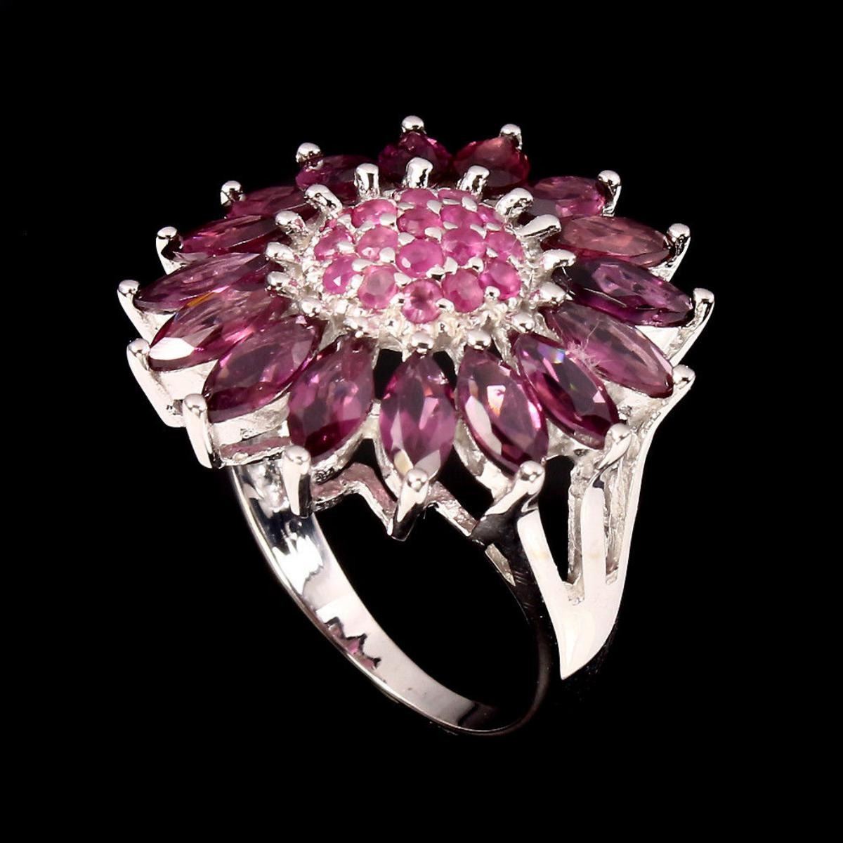 925 STERLING SILVER;PLATE...14K WHITE GOLD;RING SIZE7(resizeable)MAIN STONERUBY;OTHER GEMSRHODOLITE GARNET;TOTAL WEIGHT25.12 CT (TOTAL WEIGHT OF SILVER + STONE)DIMENSION* STONE 1.5 TO 5.0 X 2.5 MM. * FACE RING 23.0 X 22.0 MM.MAIN STONE SHAPEROUND CUTMAIN STONE COLORTOP RICH RED PINKCLARITY/GRADETRANSPARENTLUSTERELEGANT;ORIGINMOZAMBIQUEHARDNESS7.0 - 9.0
