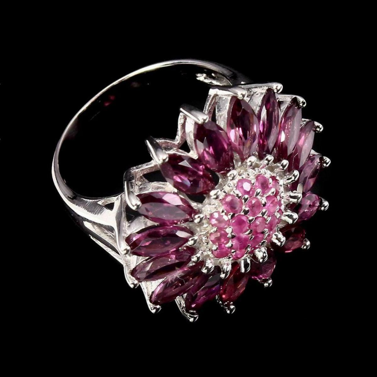 925 STERLING SILVER;PLATE...14K WHITE GOLD;RING SIZE7(resizeable)MAIN STONERUBY;OTHER GEMSRHODOLITE GARNET;TOTAL WEIGHT25.12 CT (TOTAL WEIGHT OF SILVER + STONE)DIMENSION* STONE 1.5 TO 5.0 X 2.5 MM. * FACE RING 23.0 X 22.0 MM.MAIN STONE SHAPEROUND CUTMAIN STONE COLORTOP RICH RED PINKCLARITY/GRADETRANSPARENTLUSTERELEGANT;ORIGINMOZAMBIQUEHARDNESS7.0 - 9.0